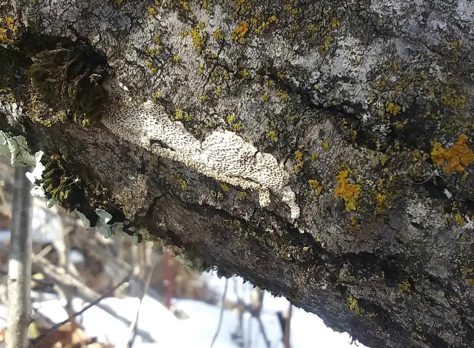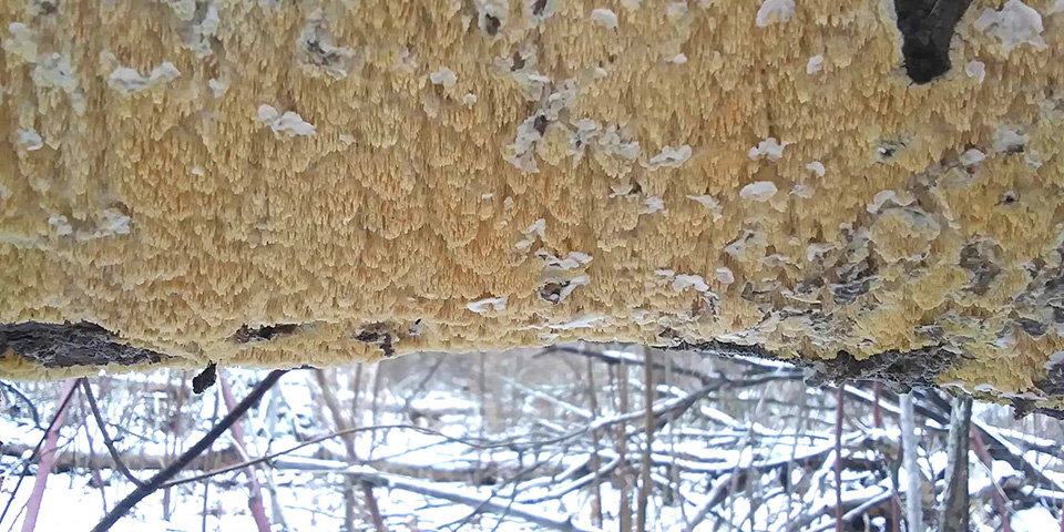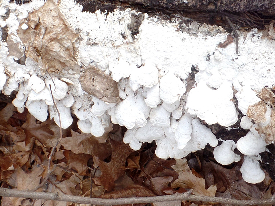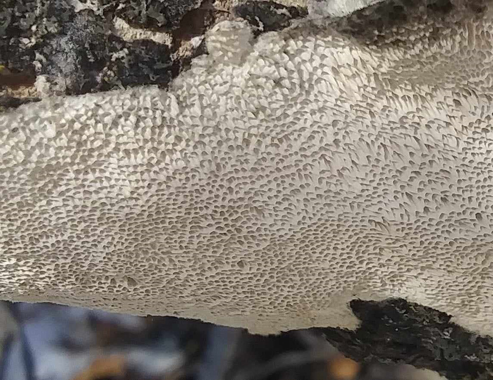 Milk-white Toothed Polypore is widespread in Europe and North America. It is very common in the eastern United States to the Midwest, including Minnesota, but rare in the Southwest. It grows flat (resupinate) on the bottom and sides of logs and fallen branches of hardwood trees, infrequently also on conifers. It usually obtains its nutrients from dead wood (saprobic), possibly also from live cherry wood (parasitic). It is exceptionally resistant to pollution toxicity. The fruiting body is a patch of pore surface spread out flat (effused) on a branch or log (substrate). It is dry, stiff, and white, off-white, or cream-colored. Adjacent patches often fuse together creating a long row. There are 2 or 3 pores every thirty-second of an inch (1 mm). The pore walls are thin and disintegrate unevenly. As the walls break down the spore surface becomes maze-like. Eventually, only flattened, tooth-like projections less than ¼″ (6 mm) long remain. When growing on the side of a log or branch it may develop shelf-like caps. If present, the cap is ⅜″ to 1½″ wide, whitish to grayish, often concentrically zoned, and densely covered with velvety hairs. There is no stem. The flesh is thin and tough. It is not edible. |