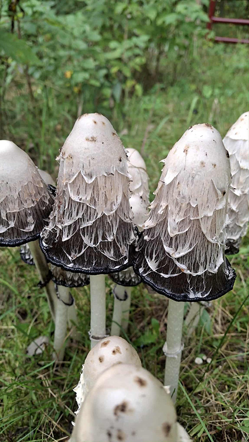 Several pillar shaped fungi popped, about 8-10 in. They changed dramatically in one day, developing a black veil the next day. |