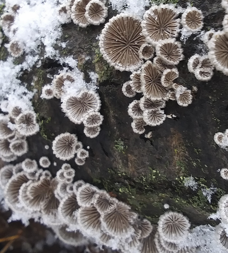 I thought this was a fuzzy white bracket fungus, but I think the gills give it away as being (Schizophyllum commune). Might be the most common fungus in the known universe, but it's the first time I've noticed it. |