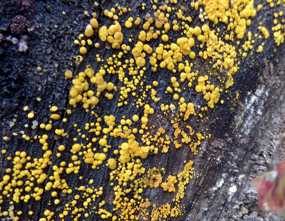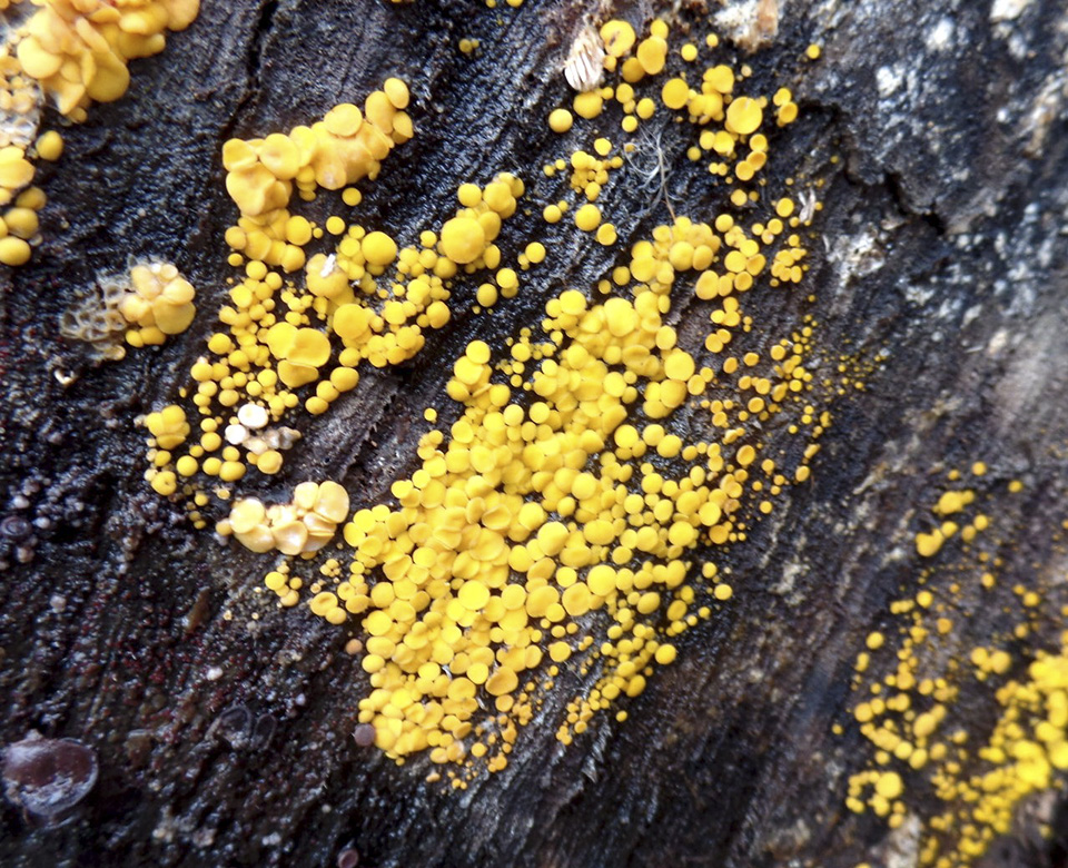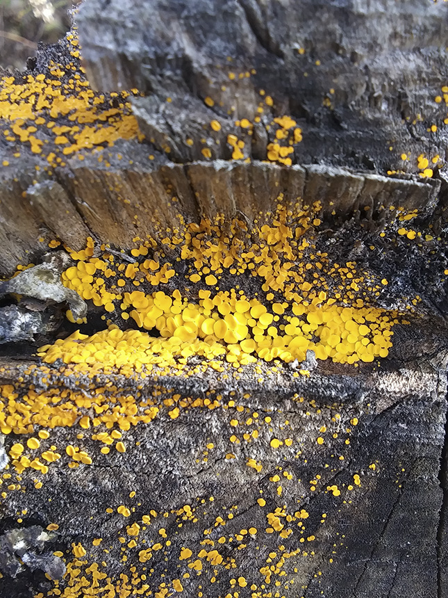 Yellow Fairy Cup Fungus is common and widespread. It is found in North America, Central and South America, Europe, Asia, and Australia. In North America it is especially common in the eastern United States and the on west coast. It is saprobic, obtaining nutrients from rotting wood. It grows in dense clusters on dead and decaying logs and stumps of hardwoods and sometimes conifers. In Minnesota it can be seen from summer through fall. The fruiting body is a small, saucer-shaped cup with or without a tiny stalk. The cups are 1 ⁄32″ to ⅛″ (1 to 3 mm) in diameter and 1 ⁄32″ to 1 ⁄16″(1 to 2 mm) tall. The species epithet citrina means “lemon yellow” but the upper surface of the cups may be bright lemon yellow or bright orangish-yellow. The underside is the same color but may be paler. They are globular when they first appear, expanding to saucer-shaped or disc-shaped as they mature. The stalk, if present, is rarely more than 1 ⁄32″ (1 mm) long. The spore print is white. |