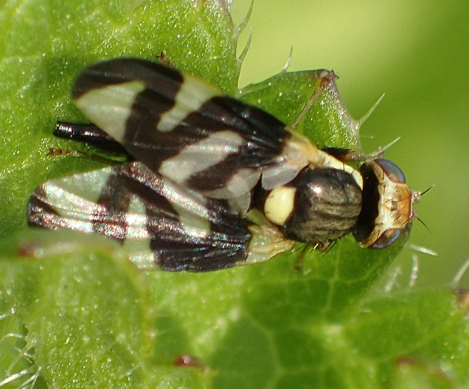 Canada thistle stem gall fly is an exotic, small, fruit fly. It is native to Central Europe. It has been intentionally released in Canada beginning in 1974 and in the United States beginning in 1977 as a biocontrol agent against invasive Canada thistle. It now occurs across southern Canada and the northern half of the United States. Adults are active from late May to mid-July. They are found wherever their host plant grows. The developing galls become visible in late July or early August, but they do not become large and obvious until late August to September. Adults are up to 5⁄16″ (8 mm) in length, including the wings. The body is 3⁄16″ to ¼″ (5 to 6 mm) in length. The thorax is black above, white on the sides. The plate between the abdomen and thorax (scutellum) is white. The abdomen is black. It is rounded on the male, pointed on the female. The ovipositor on the female is robust, black, hard, and rigid. The wings are translucent and whitish, with a bold, black, W-shaped, serpentine marking. |