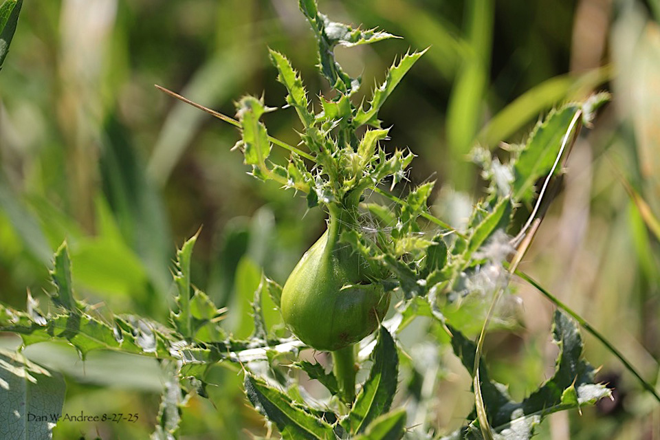A thistle with a gall... I think that is what that is … I seen it at NWR Pavia unit the other day. Also seen several meadow fritillary. I only walked out in the west end of it so can't state what else may be out there in other areas of it. |
