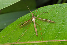 The abdomen is long and slender, and has nine evident segments. Each segment is yellowish-brown with a dark, upper (middorsal), longitudinal stripe, and a small dash-like spot on each side of the stripe. The last abdominal segment on the female has a long, acutely pointed, egg-laying apparatus (ovipositor). On the male, the last segment is enlarged into a club-shaped structure (hypopygium) that supports the copulatory apparatus.