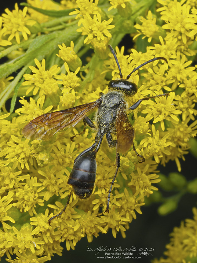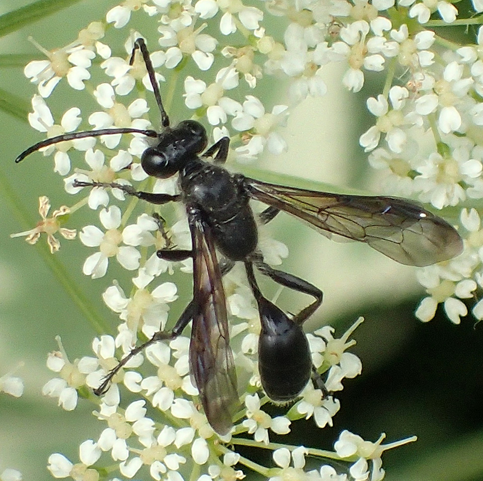 Mexican grass-carrying wasp is a slender, solitary, thread-waisted wasp. It is common in the northern half of the eastern United States and adjacent Canadian provinces. It has also been recorded, but is not common, south to Florida and west to California. It is common in the southern half of Minnesota. It is found from May to October in fields and other grassy open areas. Adults are ⅝″ to ¾″ (16 to 20 mm) in length. Females average ⅝″ (17 mm), slightly larger than males which average ⅝″ (16 mm). The head, thorax, and abdomen are completely black. The thorax is covered with long, erect, white hairs. The shield on the first segment of the thorax (pronotum) is short. There is a small rounded lobe on each side of the pronotum that does not reach the small plate (tegula) at the base of the wing. The abdomen is shiny. The first segment is contracted into a thin stalk (petiole), making the body appear “thread-waisted”. There is a small brown spot at the base of the first segment of the abdomen, where the abdomen meets the petiole. This feature is thought to be diagnostic for this species. The legs are black. On the middle leg there are two spurs at the tip (apex) of the fourth leg segment (tibia). The tibiae on the hind leg sometimes has a reddish tint. The end part of the leg, corresponding to the foot, has five segments. The last (terminal) segment on the front legs have no teeth. There are both apressed silver hairs on the face and head, and erect white and brown hairs on the face. The antennae are black. The first antenna segment is longer than the second. The wings are clear and tinted smoky brown. |