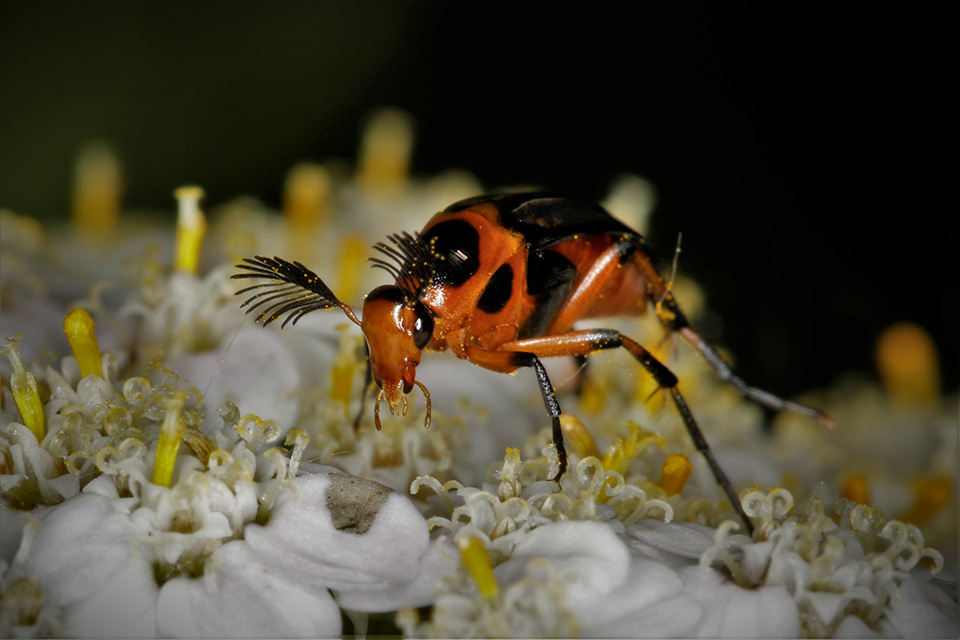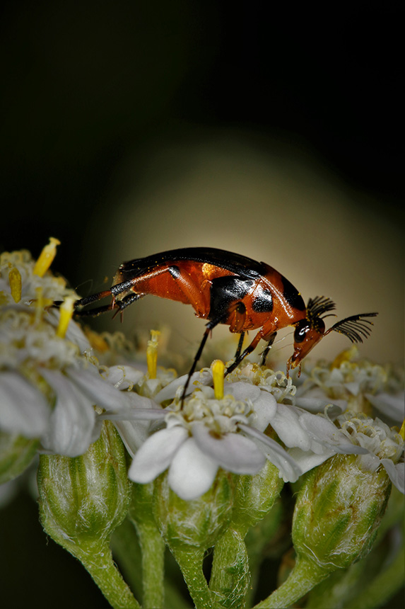 Bordered wedge-shaped beetle is a common and widely distributed, parasitic beetle. It occurs in eastern North America west to Arkansas and in Central and South America. Adults are black and orange, slender, and 3 ⁄16″ to ½″ (5 to 12 mm) long. The head is elongated, directed downward, and mostly orange. It is strongly constricted behind the eyes. The upper surface (vertex) is black, hairless, rounded, and distinctly elevated above the front (anterior) margin of the upper thoracic plate (pronotum). The upper part of the face (frons) is smooth. The upper part of the mouth (labrum), corresponding to the upper lip, is elongated and rounded at the tip. The pair of chewing structures on the mouth (mandibles) are moderately curved. They are mostly black but orange at the base. There are two small, black, oval, prominent, compound eyes and no simple eyes (ocelli). The antennae are black except for the first two segments, which are orange. The base of each antenna is near the middle of the inner margin of the eye. On the female they are deeply sawtoothed. On the male they are shorter than the pronotum and are comb-like, with dense, thick, long projections on both sides of each antenna segment (biflabellate). The projections on both sides are usually pointed forward, making the antennae appear one-sided (flabellate). The pronotum is longer than the base is wide, and slightly tapers toward the front. It is orange and has a black spot that is variable in size. It does not have a sharp lateral ridge or a distinct suture. The base has sharp, prolonged, acutely angled corners and a large triangular lobe in the middle that covers the plate over the wing bases (scutellum). The hardened forewings (elytra) are long, slightly tapered toward the end, and entirely dark brown to black. They extend well beyond the end of the abdomen. For most of their length they do not touch each other but are separated like an inverted V, exposing the brown hindwings. The legs are long and slender. The third segment of each leg (femur) is orange with a black tip. On the front legs the femur is indented at the tip. On the hind legs the femur is distinctly compressed. The fourth segment (tibia) on the front legs is entirely black. On the middle and hind legs it is usually orange on the basal half, black on the apical half, sometimes entirely black. On the front and middle legs, the last part of the leg (tarsus), corresponding to the foot, is black and has five segments. On the hind leg it has only four segments. The inner surface is smooth and hairless. The second tarsal segment on the hind leg is flat, shiny above, and about half as long as the third segment. There is a pair of claws at the end of each tarsus. Each claw is split in two. |