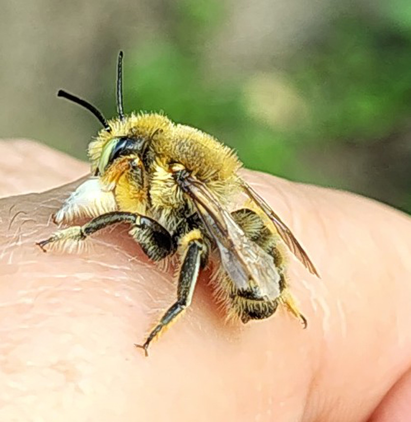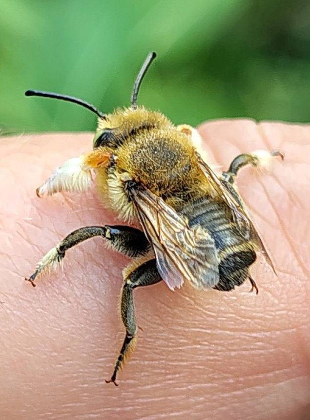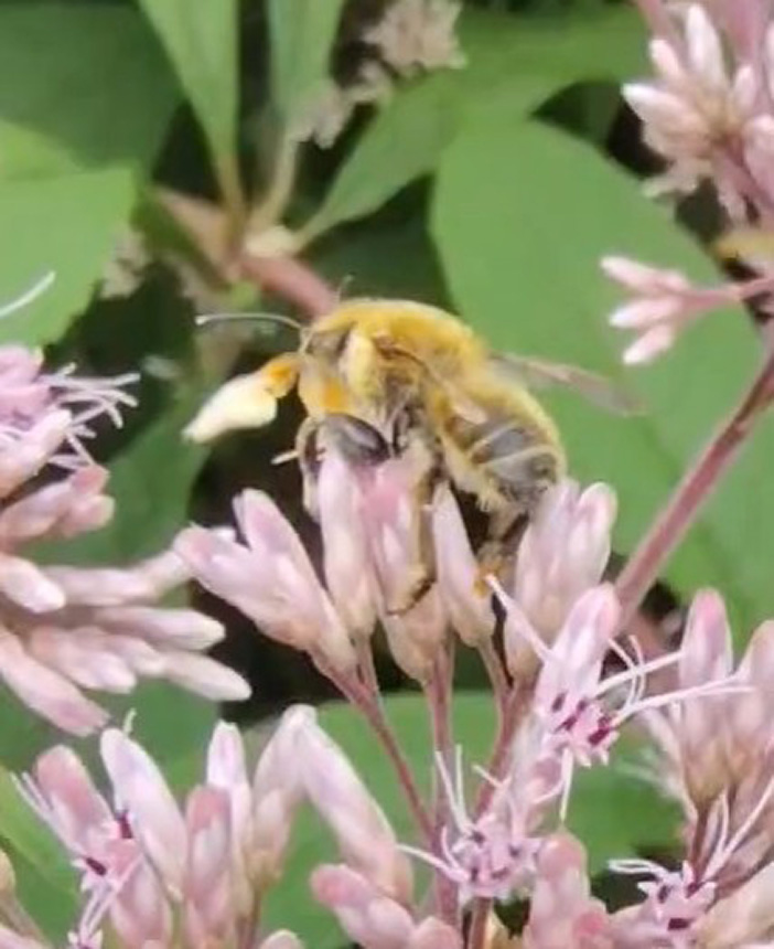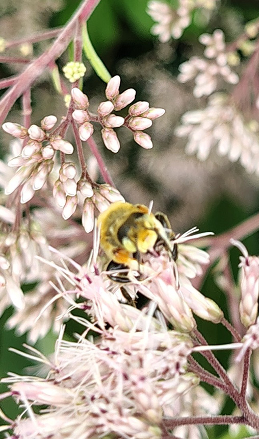 I found this bee on a plantain seed stalk. After watching it a bit, I was curious about it and let it crawl onto my finger. It seemed like it might not be able to fly yet, so I placed it onto the Joe Pye that was next to me (it didn't fly there). It seemed to get busy, but sounds like they need or prefer legumes. |