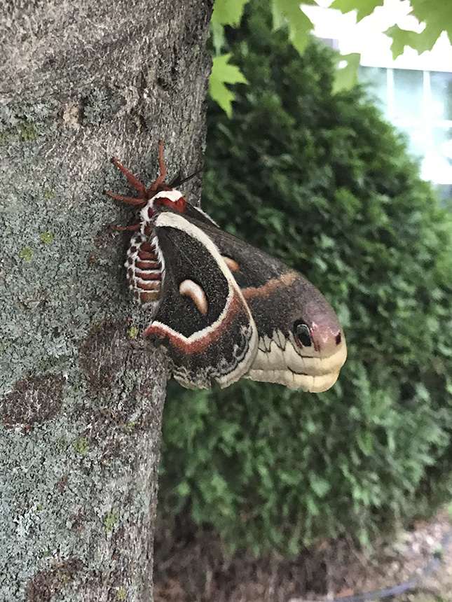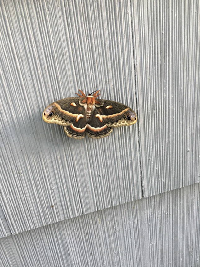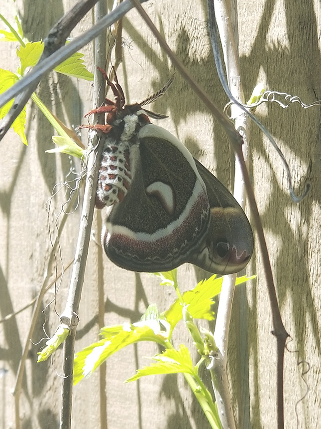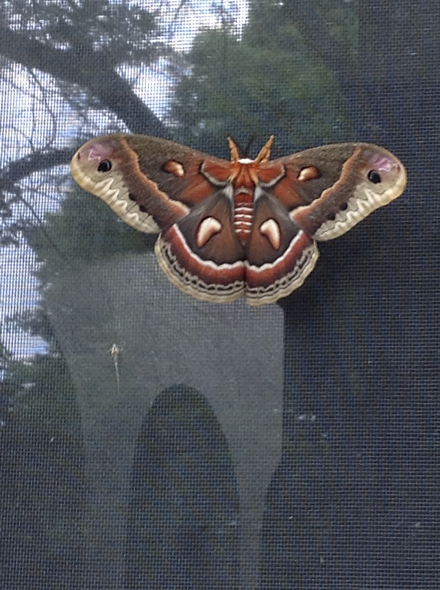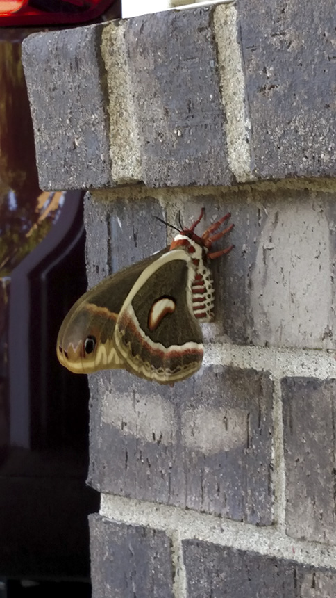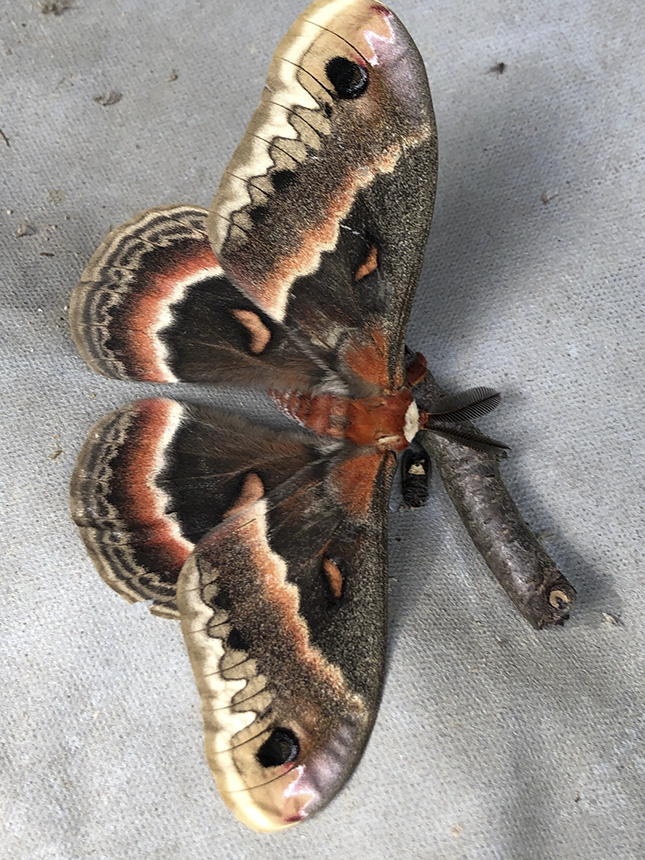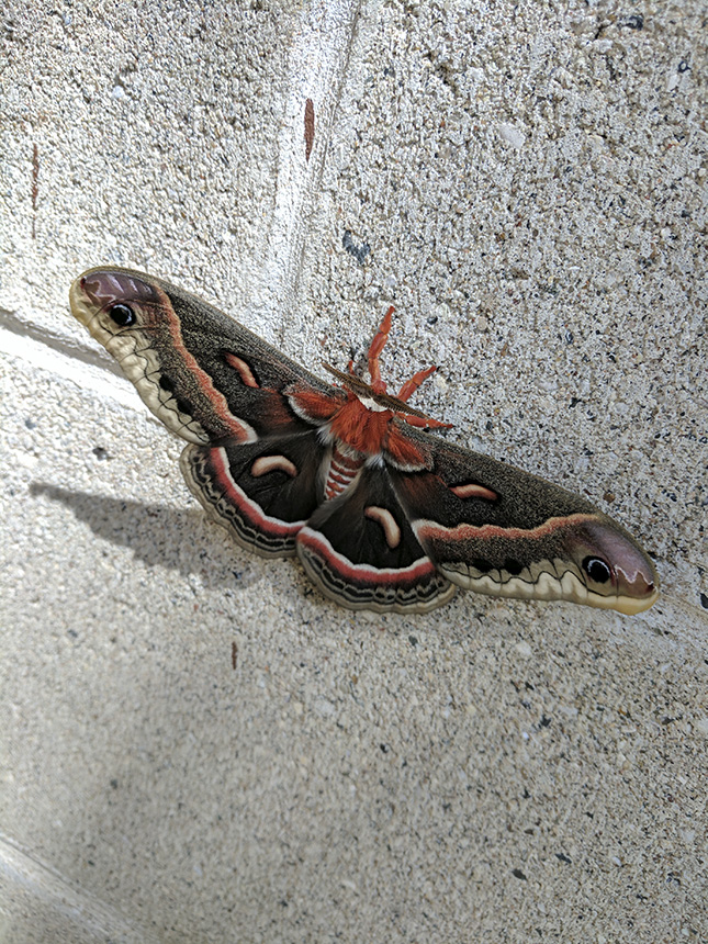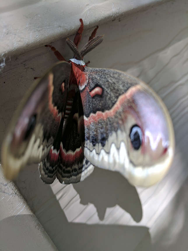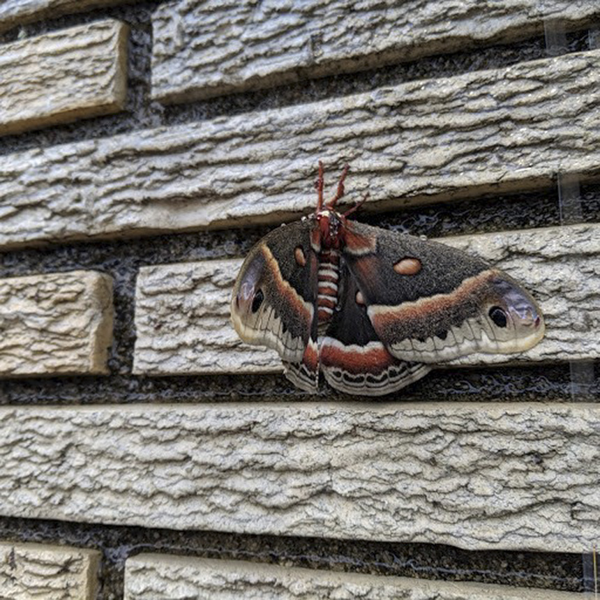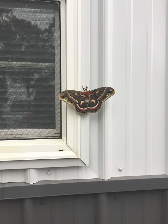 Captured Cecropia Moth and relocated it to a safer place.... This past week I was at a convenience store fueling up and a woman who worked there came over to me all excited and asked me what this was? She said if flew out from underneath something and scared her. I told her it is just a big moth and they are harmless. She asked what kind is it? I told her it’s kind of an unusual name it’s a Cecropia. I told her they usually are out at night and it's really kind of out of its element. |