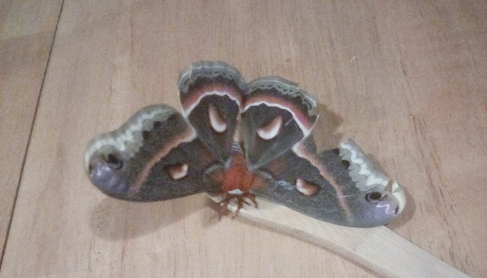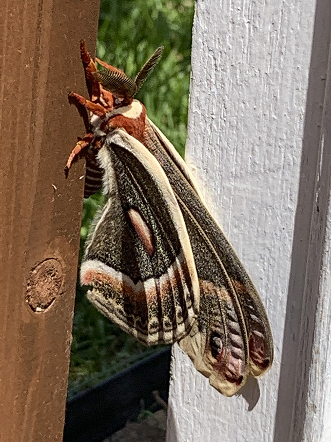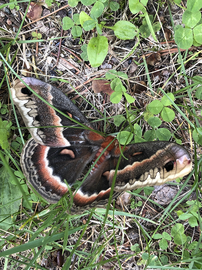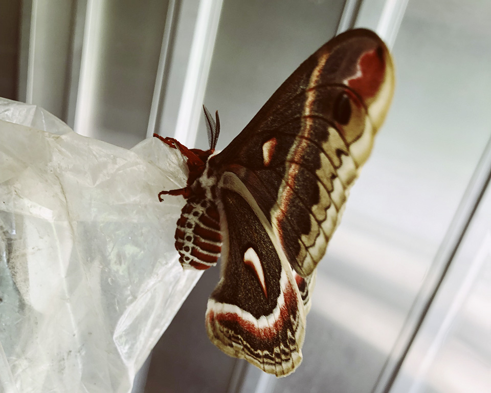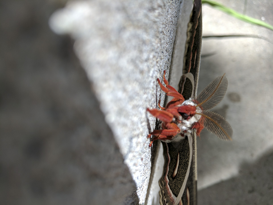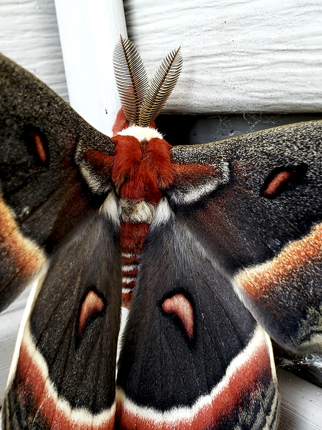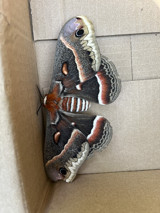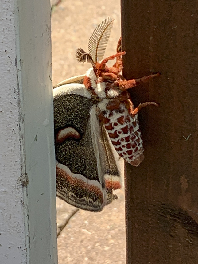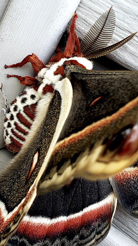 Captured Cecropia Moth and relocated it to a safer place.... This past week I was at a convenience store fueling up and a woman who worked there came over to me all excited and asked me what this was? She said if flew out from underneath something and scared her. I told her it is just a big moth and they are harmless. She asked what kind is it? I told her it’s kind of an unusual name it’s a Cecropia. I told her they usually are out at night and it's really kind of out of its element. |