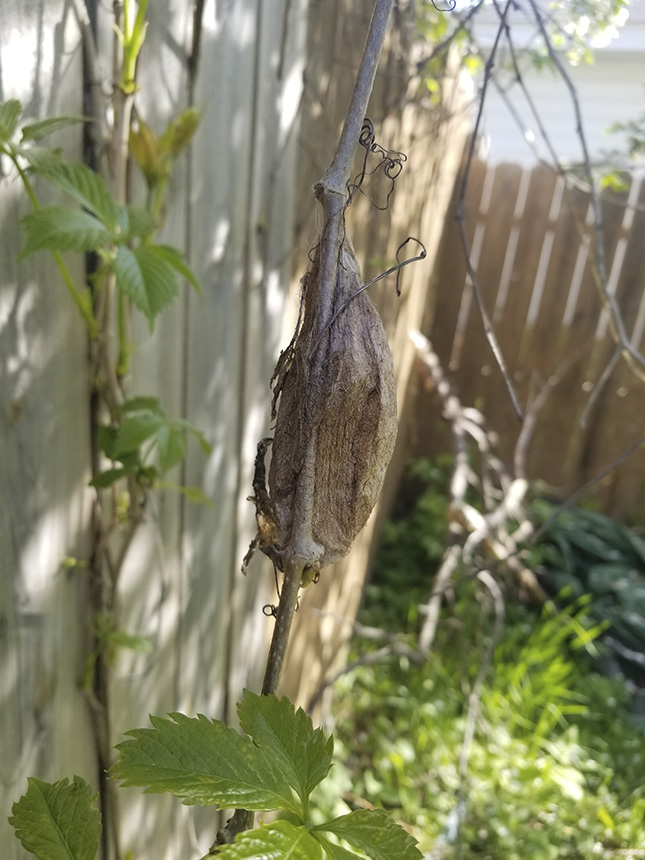 Location: Duluth, MN 55807 (St Louis County) 2 cocoons and a moth hanging in the vines by my blooming apple tree this year! |