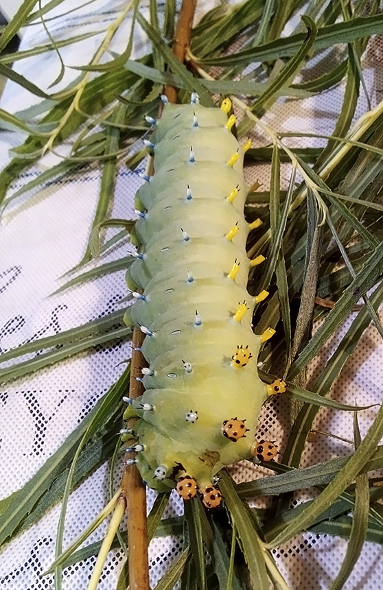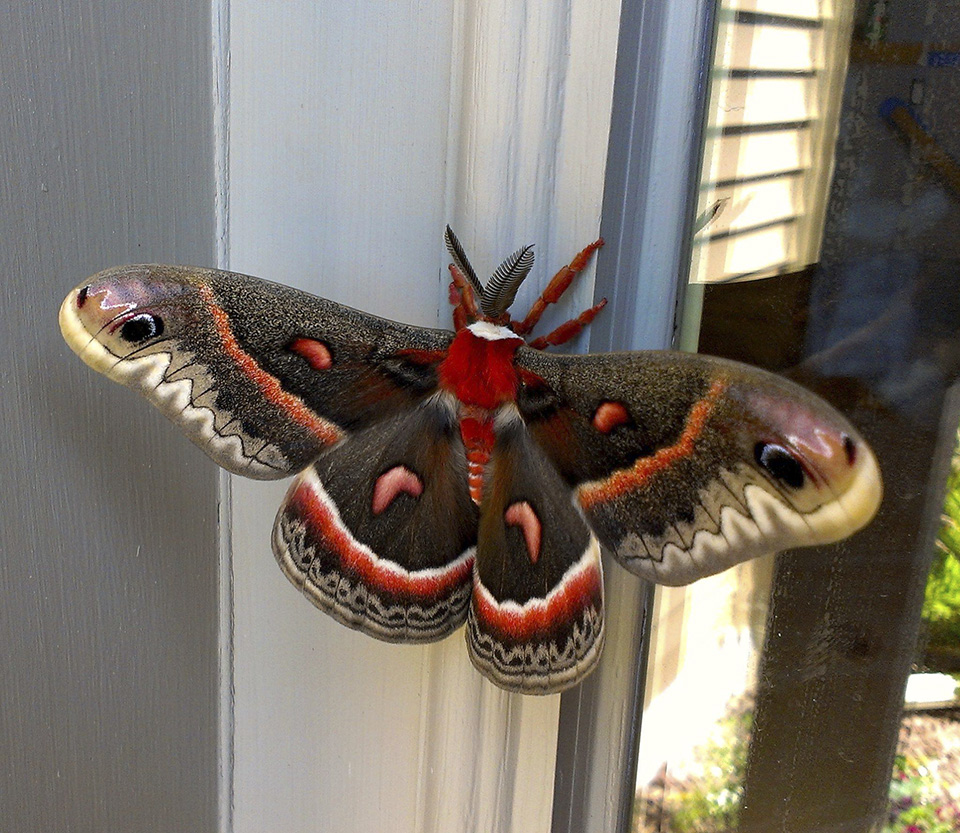Cecropia moth is a common, extra large, giant silkworm moth. It is one of the two largest moths native to North America. The number of cecropia moths has decreased in recent decades due to parasitism of a tachinid fly (Compsilura concinnata). The fly was introduced into North America in 1906 in an attempt to control the gypsy moth (Lymantria dispar). Adults have a wingspan of 45 ⁄16″ to 5⅞″. The thorax is red above with a conspicuous white collar. The white collar is the forward apex of a broad, white, lateral stripe that extends from the thorax to the last abdominal segment. Each abdominal segment is red, outlined with a thin black line; has a fringe of white hairs at the end; and has a red spot in each lateral stripe. The wings are dark brown, gray, and blackish with numerous white scales giving them a frosted appearance. The basal area of the forewing has at least some red shading and is bordered with a thin white and a thin black antemedial line. Both wings have red shading outside a strong white postmedial line. The forewing has a crescent-shaped spot in the median area near the leading edge. Each hindwing has a crescent-shaped spot near the outer margin of the discal cell. All four spots are red fading to white in the center and outlined with black. There is an eyespot in the subapical area near the tip of the forewing. The head is red. There are no mouth parts and no hearing organs. The eyes are large and black. The antennae are feather-like and have branches on both sides of the central axis. The legs are red. Females have smaller, less bushy antennae and larger, more rounded abdomens. The caterpillar is frosted green and up to 4″ long. There is a pair of prominent knobs in the dorsal area on thoracic segments 2 and 3 (T2 and T3) and on abdominal segments 1 through 7 (A1–A7). Abdominal segment 8 (A8) has a single dorsal knob. The dorsal knobs on T2, T3, and A1 are more or less globe shaped and have several tufts of minute black spines (spinules). The dorsal knobs on A2–A8 are elongated and cylindrical. The dorsal knobs on T2 and T3 are yellowish-orange. Those on T3 and A1–A7 are bright yellow. There is also a solitary knob in the subdorsal and spiracular areas of T1–T3 and A1–A8, and in the subspiracular area of T1 through T3. These knobs are pale blue and rise from a pale blue base. The leg-like structures (prolegs) on the abdomen are yellowish-green at the base and greenish-yellow at the tip. Mature caterpillars can be found from late June through August. |
