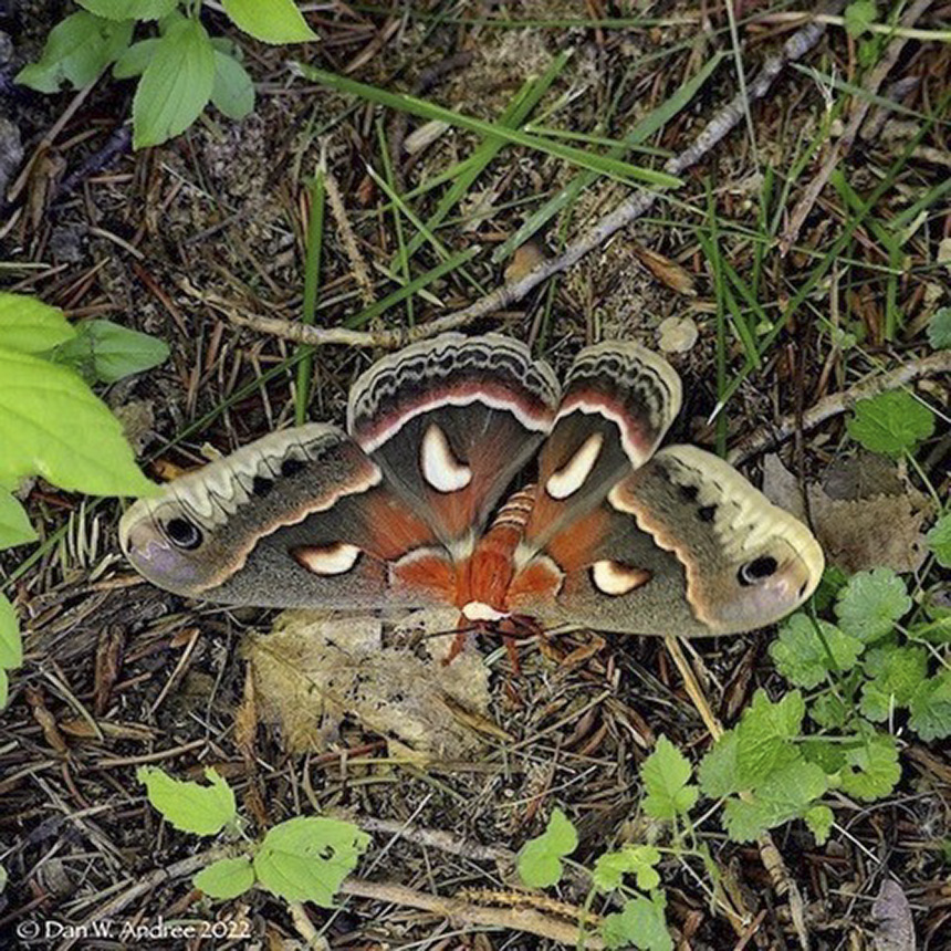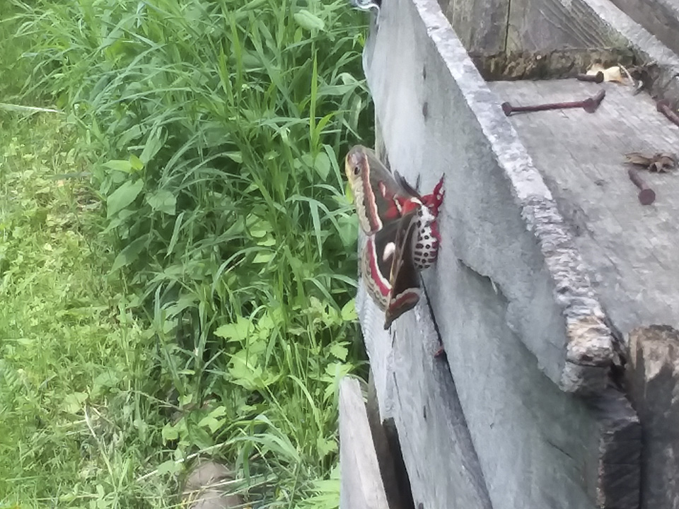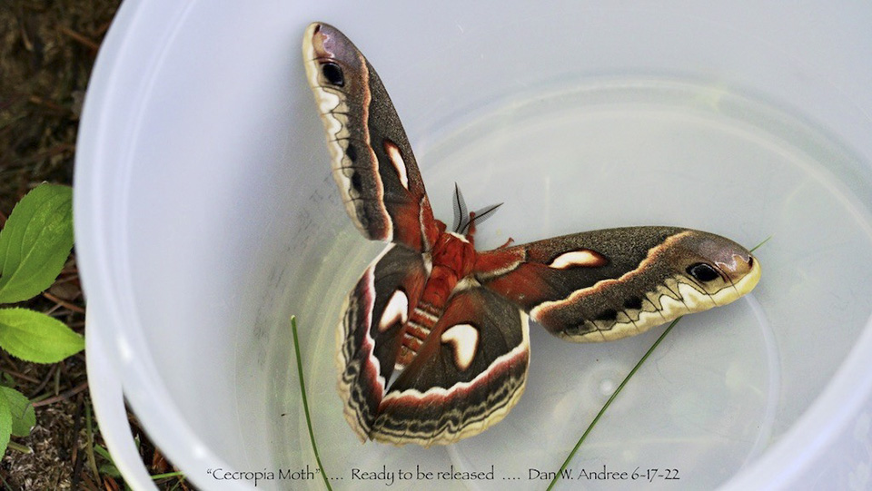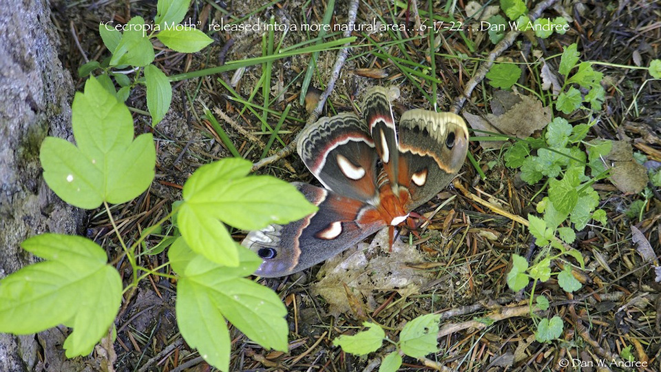 Anyway I let it go in a more natural area with spruce, birch, boxelder and a maple tree in shade etc. Once out of the bucket it sat on the ground briefly then started fluttering (more like shivering) its wings. I'm guessing it was getting its circulation going or something. It wasn’t long it flew into the air and then around to a shaded area and landed somewhere. Anyway felt better the big moth was no longer clinging to the side of a gas pump area. Cecropia Moths are big and beautiful gentle creatures. The area released was in Norman Co. Mn.….my back yard. It didn’t sit to long before taking off. I did grab my camera and take a couple photos though. This is a cropped one. Shot a little very brief 4k video. I didn’t know how long it would sit or what it was going to do once out of the bucket. So was unprepared and also just let it do its thing and take off on its own free will. It was nice to see it take off. Though I didn’t get any photos or video of it doing that just sitting still a couple seconds before it started shivering its wings. I had seen Monarchs and Regals do that before occasionally. I stopped filming it because it was just kind of shivering. So decided to try take a couple photos. It stopped shivering so to speak then after a few seconds just flew off. |