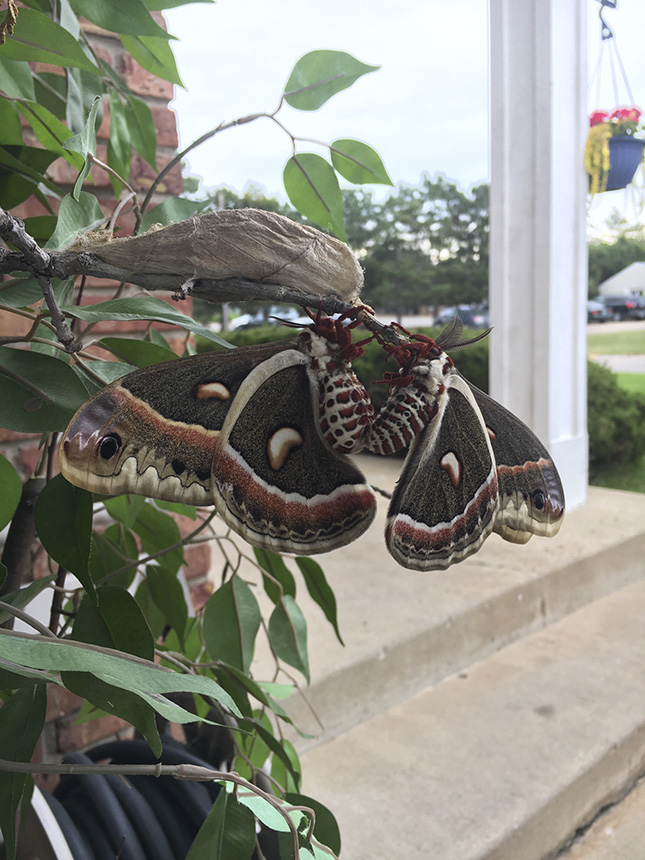 My husband was on the roof cleaning off the gutters when he saw the chrysalis. We put it in a safe spot until she hatched. She hatched, and not even 5 hours later was there a male attached to her. We watched it all happen. And we have the males body as a keepsake. |