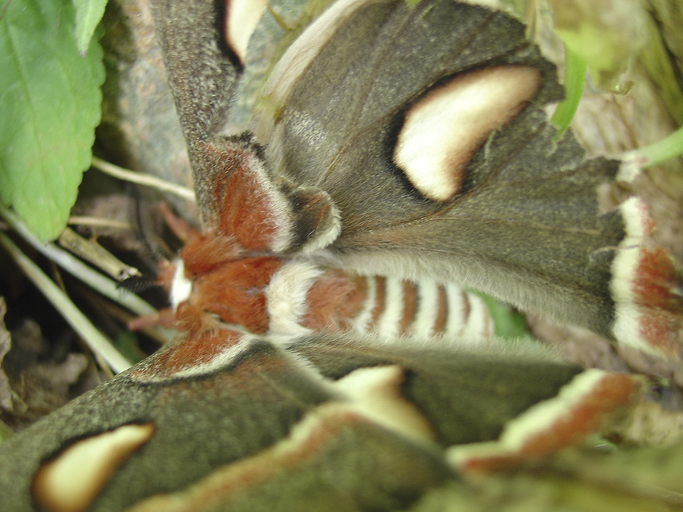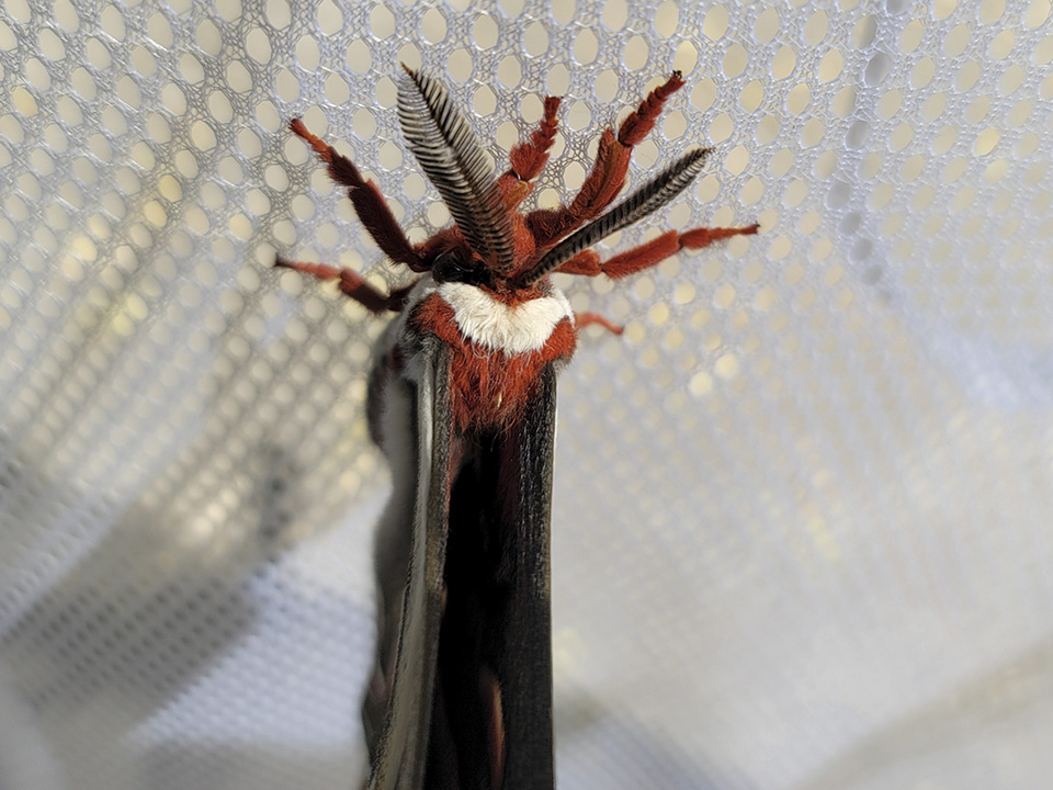 This moth is short-lived, lasting about two weeks, since it has no mouth parts and does not feed. There is one generation per year. The male uses its specialized antennae to detect pheromones released by the female. After breeding, the female lays a group of 3 to 30 large, somewhat flattened eggs in lines (rafts) of 3 to 10 eggs each on either side of a leaf of a host shrub or tree. The eggs hatch in 10 to 14 days and the newly emerged larvae begin feeding in groups on the leaves. Older caterpillars are solitary feeders. The larvae molt 5 or 6 times. In the fall the caterpillar spins a cocoon in which it will spend the winter. The cocoon is large and spindle-shaped. It is attached along its full length to a twig in a dark, protected area. The adult emerges in the spring. |