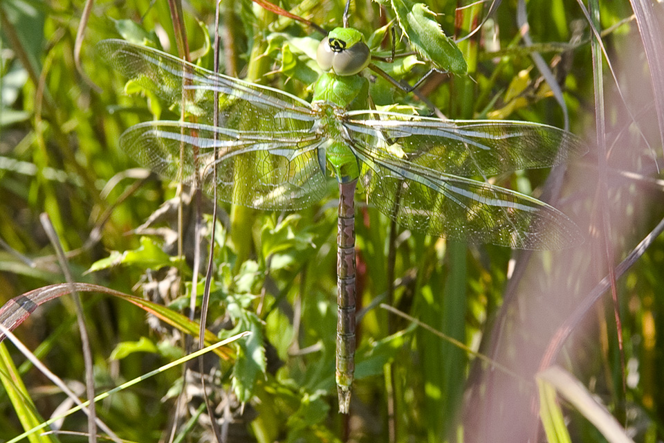 Juveniles in Canada and the northern Unites States flock together in the fall and migrate south, following the north shore of Lake Superior for part of their route. Radio tagging has shown that they fly as much as 87 miles in a day. American Kestrels (Falco sparverius) migrate at the same time using the same route, and may use the darner migration as a food source during their migration. There is also a resident population that overwinters as larvae. The migrant population reproduces in the southern United States and their offspring migrate north in the spring. Eggs are deposited inside the stem of emergent vegetation below the waterline. This is the only darner that lays eggs while the male and female are still in tandem. The naiads take several years to mature. When they mature they crawl up an emergent plant and an adult emerges at night. |