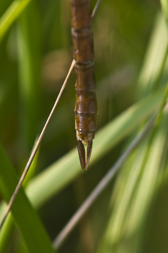 Common green darner is a large, common dragonfly. It is 2⅔″ to 3⅛″ long, averaging 3″ long. It is the most common darner in North America. There is a black spot enclosed by a medium to dark blue semi-circle that forms a “bull’s eye” spot in front of the eyes. The eyes are medium brown, the color of milk chocolate, with a yellow rear (posterior) rim. The thorax is bright green and is not striped. The abdomen is thick compared to other darners. The male abdomen has a dark purple top (dorsal) stripe and wide, bright blue side (lateral) stripes. The lateral stripes change to green toward the rear. The base of segment 3 (S3), the long and narrow segment close to the thorax, is white. When in flight, the abdomen is carried straight. The female abdomen is similar but with grayish-green lateral stripes. In cool weather the lateral stripes of both sexes fade to the same color as the dorsal stripe. S2 is the last segment to fade. Immature individuals of both sexes have a brownish-red abdomen. On the male the pair of appendages at the end of the abdomen (cerci) have a pointed spine at the outer corner. The wingspan is up to 4⅜″. The wings are clear and have a small yellow area near the tip. The hindwing triangle and the forewing triangle are the same size. |