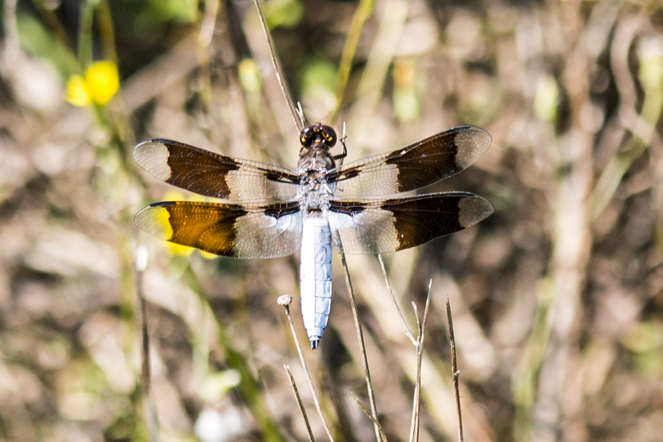 Twelve-spotted skimmer (Libellula pulchella) lateral white line on the female abdomen is solid and straight. |