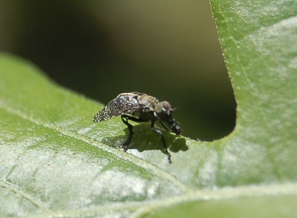 Dancing kiss fly is an exotic signal fly. It is native to Europe and has been introduced into the United States. The first North American record is in Chicago in 2003. From that location it has spread throughout northeastern Illinois and into southeastern Wisconsin, and it has jumped to the Twin Cities metro area in Minnesota. Adults are found from May to October, low in vegetation, at forest edges and in hedges. They feed on flower nectar and pollen. Larvae probably feed on dead plant or animal matter, like most signal flies. Adults are 3⁄16″ to ¼″ (5 to 7 mm) in length. The head is large, higher than long, and yellowish-brown to blackish-brown. There are two large compound eyes at the side of the head and three small simple eyes (ocelli) in a triangle at the top of the head. The compound eyes are reddish-brown. They do not meet at the top of the head in either sex. The area between the ocelli (ocellar triangle) is black. There are no bristles on the front of the head. The upper face, corresponding to the forehead (frons) is black. The face is black and shiny with silvery-white hairs. There is a line of dense hairs on the orbits around the compound eyes, and a line of minute hairs from the ocellar triangle down the frons. The antennae are short and have three segments. The second segment does not have a longitudinal groove (suture). The third segment is rounded at the tip and has a short, forward-pointing bristle (arista) on the upper side. The collection of protruding mouthparts (proboscis) is reddish-brown and large. This is the feature that gives the family Platystomatidae, meaning “big mouth”, its common name. The thorax is black and is scattered with areas of dense yellowish-brown hairs. It appears grayish-brown from a distance, mottled when seen close up. On the front of the thorax there are no propleural bristles, and on the underside there are no sternopleural bristles. The abdomen is black and uniformly scattered with areas of dense white hairs. It appears grayish from a distance, mottled when seen close up. The legs are mostly black. On the middle legs there is a row of black spines on the underside of the fourth segment (tibia). The last part of the leg, corresponding to the foot (tarsus) has five segments. On all legs the tarsi have yellowish areas and have short black spines on the underside. The wings are dark brown to black with scattered, whitish, translucent (hyaline) areas, making them appear mottled. The anal cell is rounded at the tip. The vein on the leading edge of the wing (costal vein) is not broken near the end of the subcostal vein. |