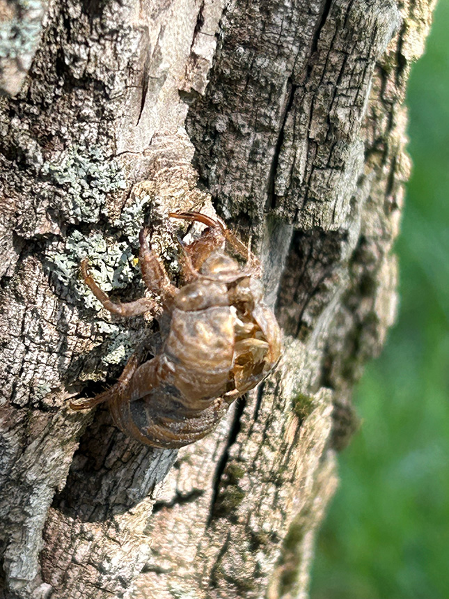Dog Day Cicada exoskeleton, about 3 feet off the ground on a tree trunk. Did not see the cicada but will keep looking! |