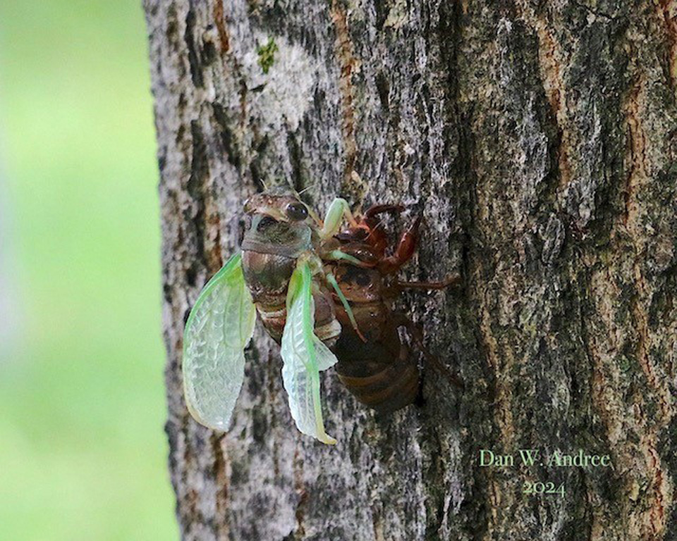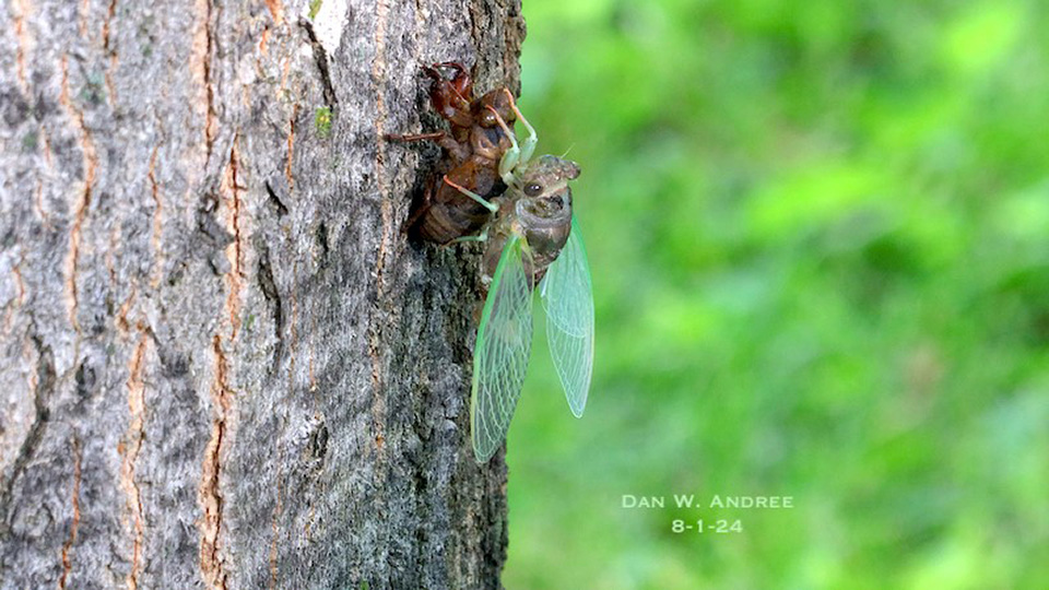 Dog Day Cicada... Cicadas had been emerging in July, but the weather changed while some were trying to emerge out of the nymph stage but I noticed one that seemed to just died trying. It was during a almost fall like temp drop. Cicadas like it warmer. I haven’t even heard them other than a few faint sounds. I read that they become vocal during warm or hot days and are silent on cooler ones. Maybe by the weekend when it is suppose to be close to 90 they will be sounding off. |