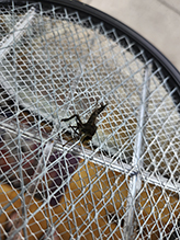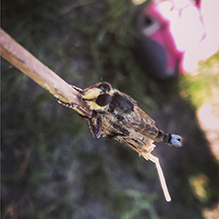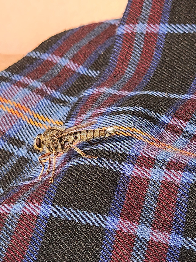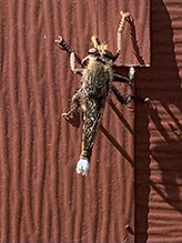 False bee-killer is a large robber fly. It occurs in the United States east of the Great Plains and in adjacent Canadian provinces. It is most common in the southeastern states. It is uncommon in Minnesota. Adults are 1″ to 1¼″ in length, the females a little larger than the males. The thorax is arched and stout. The abdomen is half cylindrical, rounded on top, flat below, widest at the base, and tapering to the tip. It is black above, brown below and on the sides. On the male there is a ring of white or yellow hairs at the rear margin of each of the first four or five abdominal segments, and a pair of white hair tufts above at the tip that can be easily seen when the male is in flight. There are two large compound eyes and three small simple eyes (ocelli). The compound eyes extend above the level of the top of the head (vertex), making the head appear hollowed out between the eyes when viewed from the front. They do not meet at the top of the head on either sex. The ocelli are arranged in a triangle on a prominent rounded projection (tubercle) in the middle of the head between the compound eyes. The upper face is covered with long, erect hairs. There is a dense mustache of long stiff bristles (mystax) on the face between the compound eyes at the lower margin, and a cluster of forward-directed bristles (a “beard”) on the lower part of the face. The hairs on the upper face, the mystax, and the beard are all yellow or yellowish-white. The antennae are short and have 3 segments. The third segment is elongated but is not subdivided by rings (annulated) and does not have a long bristle (arista). The legs are stout. The last part of the leg (tarsus), corresponding to the foot, has five segments. The last segment has 2 pads. On the wing, the anal cell is longer than the second basal cell and is closed near the wing margin. |