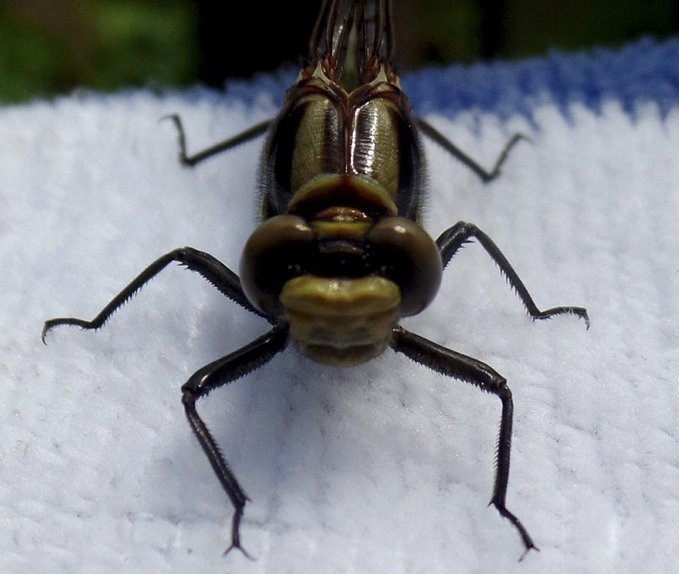 Four-spotted skimmer is an early season, medium-sized, 1⅝″to 1¾″ long skimmer. Males and females are similar in appearance. Juveniles and young adults are highly colorful and easily identifiable. The thorax and abdomen are densely covered with short hairs. The upper side of the thorax and abdominal segments 1 through 6 are bright yellowish-brown. Abdominal segments 7 through 10 are black. Each abdominal segment has two narrow yellow spots forming a continuous stripe on each side of the abdomen. The female’s abdomen is tapered like the male’s. The leading edge of each wing has a broad amber streak with yellow veins, a small black spot at the notch in the middle (nodus), and a dark stigma near the end. The base of each hindwing, where the wing attaches to the thorax, has a triangular black patch with yellow veins. The wings are otherwise clear. The forewing and hindwing triangles are a different size and shape. The face is yellow. The eyes are brown and meet at the top of the head. On mature individuals the yellowish-brown areas of the thorax and abdomen become dull grayish-brown and the wings lose most of their amber color. Eight-spotted skimmer has two large spots on each wing for a total of eight. Twelve-spotted skimmer has three large dark spots on each wing for a total of twelve. Four-spotted skimmer has two small dark spots on each wing and one large spot on each hindwing for a total of ten. A more appropriate name might be ten-spotted skimmer (Libellula decamaculata). |