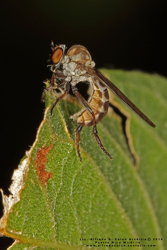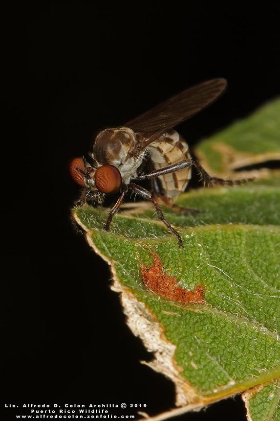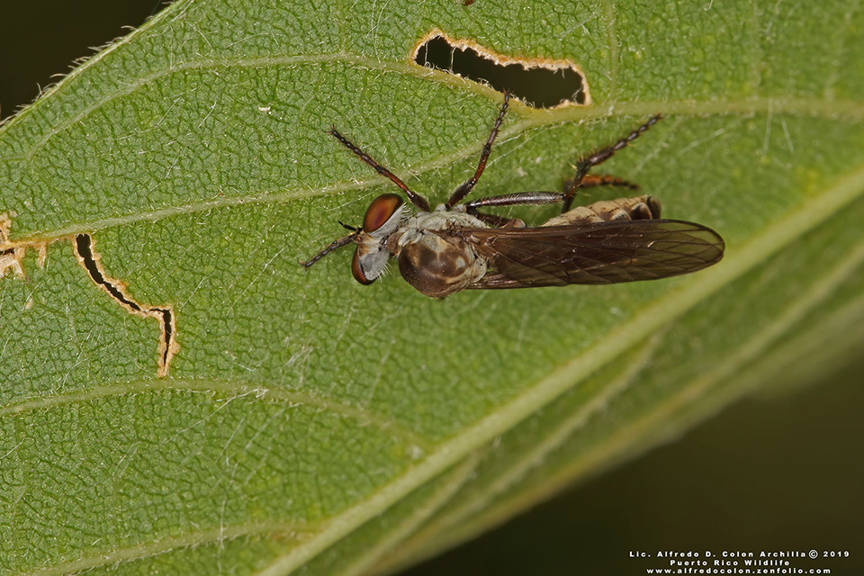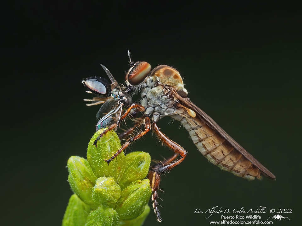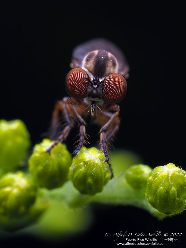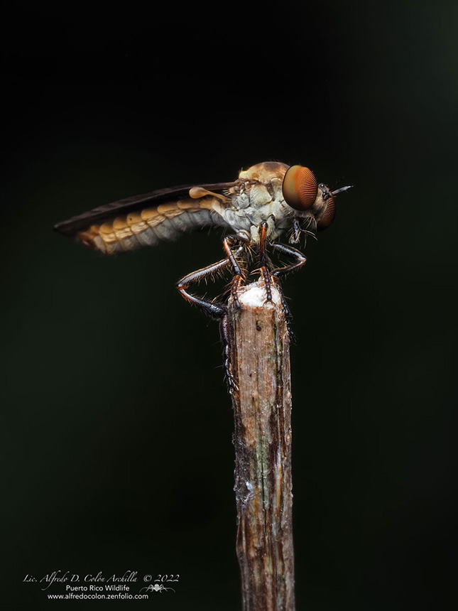 Golden goggle eye is a small gnat ogre. It occurs in North America from Quebec to Florida west to Minnesota and eastern Texas. Adults are found from early July to early September in damp, grassy, open areas near woodlands.