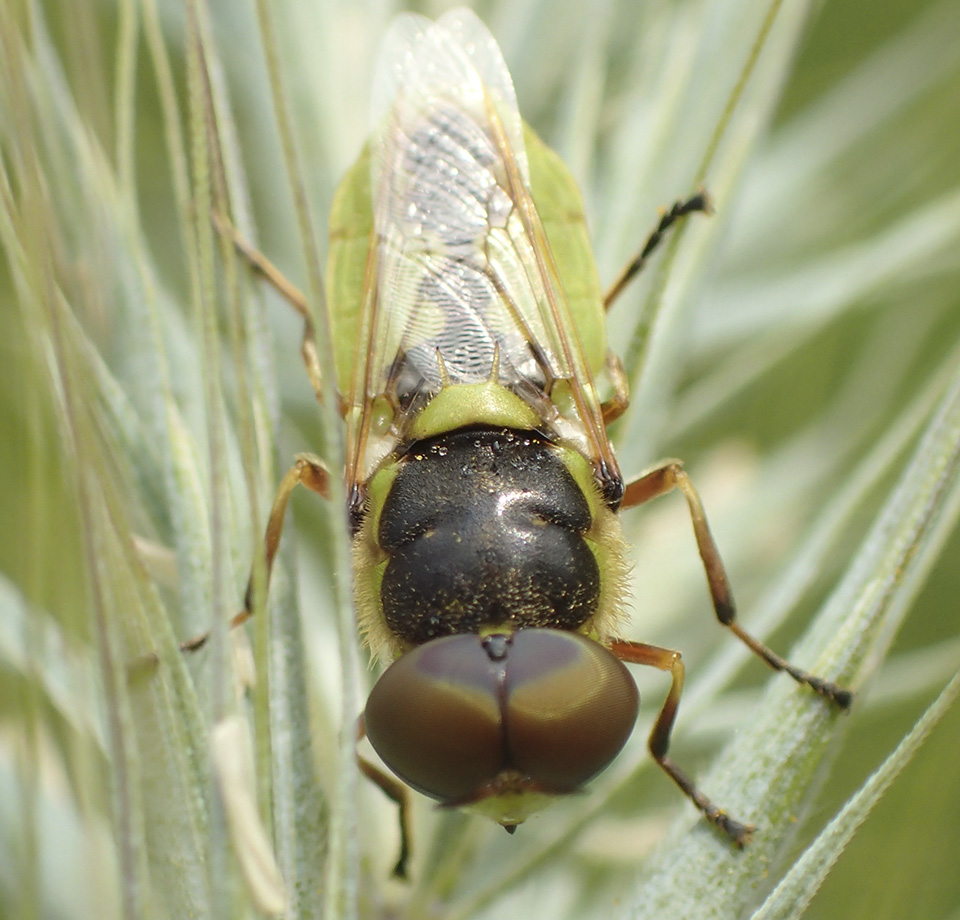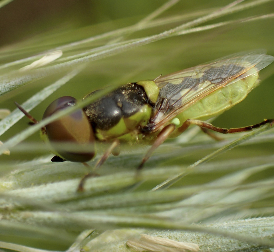 Hedriodiscus binotatus group soldier fly with brown and green abdomen Hedriodiscus binotatus group, soldier fly with green abdomen and brown markings, on Canada wild rye grass. Barnes Prairie, Racine County, WI, July 16, 2021. |