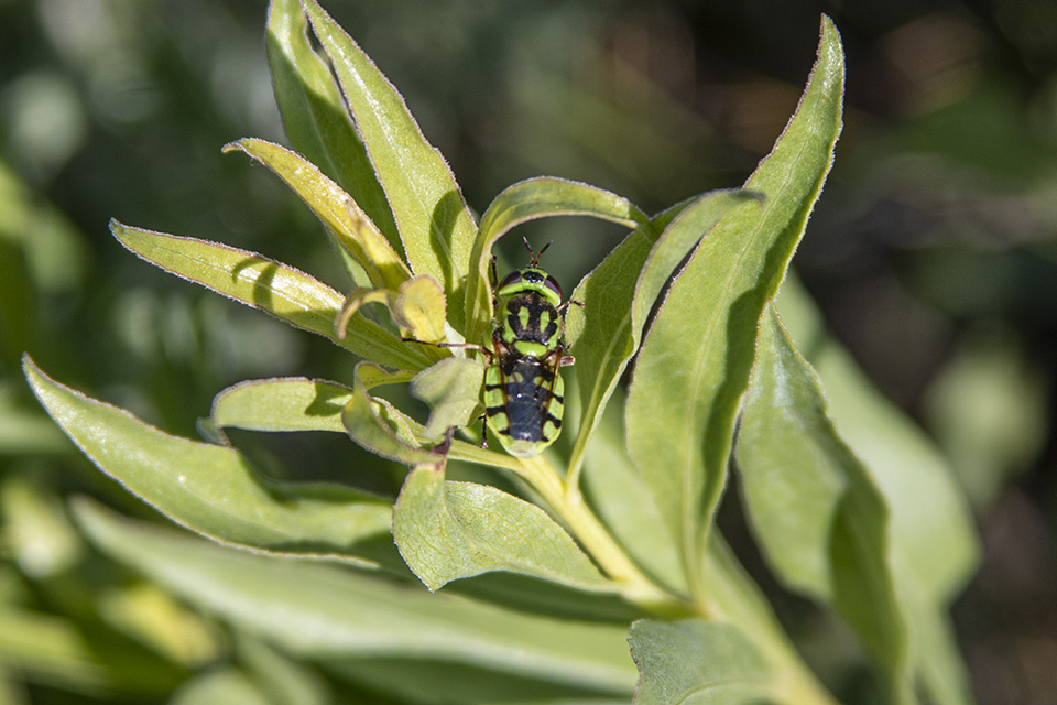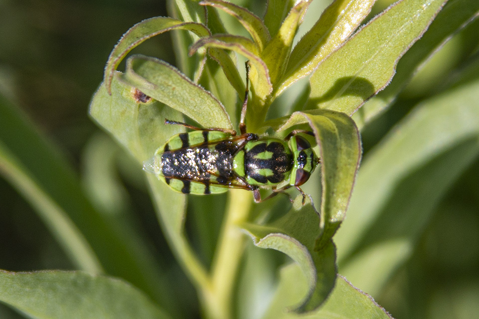 Green soldier fly is a large, wasp-like, soldier fly. It occurs in southern Canada, the United States, and northern Mexico. The larvae are aquatic, and adults are always found near water. Adults are ⅜″ to ⅝″ (10 to 15 mm) in length. On the female, the head is more or less hemispherical. There are two large compound eyes on the side of the head and three small but prominent simple eyes (ocelli) in a triangle at the top of the head. The compound eyes are widely separated at the top of the head. The face is green. The forehead (frons) is green with a wavy black horizontal line above the antennae bases. The top of the head (vertex) is green except for a large, oval, black area around the ocelli. The antennae are long (for a fly) and are inserted just above the middle of the face. They have three segments. The first two segments are reddish-brown, the third segment is black, at least at the tip, and is divided into five ring-like segments (annulated). It does not have a bristle-like appendage (arista). The thorax is black above and green on the sides, with two green spots in the middle. This is the feature that gives the fly the species epithet binotatus, meaning “twice-marked”. The spots are highly variable in size, from elongate and almost reaching the rear margin, to round and tiny. On some individuals the spots are inconspicuous or missing. The exoskeletal plate between the wing bases (scutellum) is green and has two yellowish spines. The abdomen is green with a black band at the base of each segment. The width of the bands is variable, sometimes dilated in the middle and meeting the band on an adjacent segment. The underside of the abdomen is entirely green. The legs are moderately long and mostly reddish-brown. On each leg the base of the third segment (femur) and the base of the fourth segment (tibia) are yellow. The wings are clear with brownish-yellow veins. Three veins of equal length extend from the discal cell. There are five distinct cells at the outer part of the wing. The radial vein (R) has two branches, and they are crowded in the front of the wing. The posterior branch (Rs) has three branches. The posterior branch of Rs (R5) ends at the margin before the wing tip. The anal cell is longer than the second basal cell and is closed near the wing tip. On the male, the compound eyes meet at the top of the head. The face is entirely green with no black markings. On the front legs, the tip of the femur, the base of the tibia, and the last part of the leg (tarsus), corresponding to the foot, are black. |