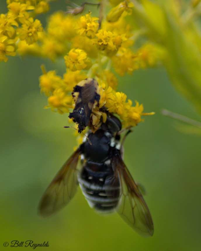 A mimic and an ambush! A Jagged Ambush bug caught itself a Bald-faced Hornet fly. A bit windy today, so I was struggling to get a good image. I coaxed the fly away from the Ambush bug, it keeping the head, to verified I was looking at a mimic or the real thing. |