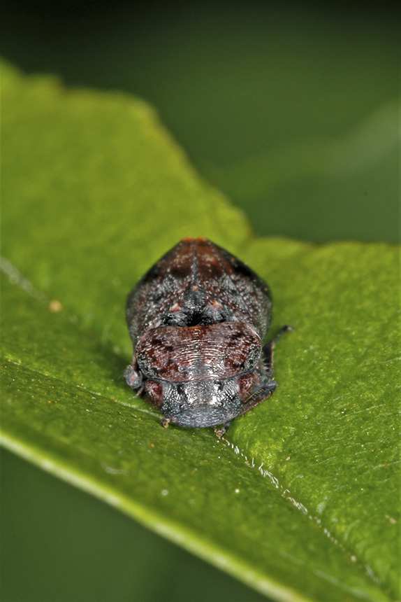 Penthimia americana is an rare and unusual leafhopper. It occurs in North America east of the Great Plains. It is rare throughout its range, including in Minnesota. It is unusual because it resembles a spittlebug, looking nothing like other leafhoppers. Adults are short, 3 ⁄16″ to ¼″ (5 to 6 mm) long. The body is smooth, shiny, and oval when viewed from above, convex when viewed from the side. The overall color varies from reddish-brown to black with numerous, small, white or pale spots. The head is short and very broad, almost as wide as the exoskeletal plate covering the thorax (pronotum). The back of the head (vertex) is very broadly rounded. The pronotum is widest at the base, narrower toward the head. The rear margin is broadly concave. The surface has distinct horizontal grooves. The plate between the wing bases (scutellum) is large and triangular. The forewings (hemelytra) are thickened, leathery, very broad, and short, though long enough to completely cover the abdomen. They are widest in the middle and broadly rounded to a blunt point at the tip. There is an extension (selvage) at each wingtip which overlaps the adjacent wing. The selvage is broadly rounded. The hindwings are thin, membranous, a little shorter than the hemelytra, and concealed beneath the hemelytra. The fourth segment (tibia) of the hind leg has a row of spines. The last part of the leg (tarsus), corresponding to a foot, has three segments. |