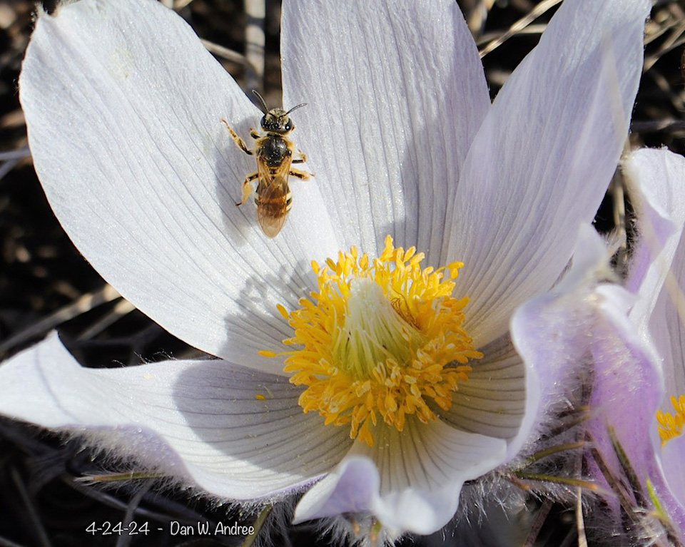 Here is another photo of that small bee or... small wasp. It was maybe half an inch long. The pasque flower blossom shown was fairly large for a pasque flower. |