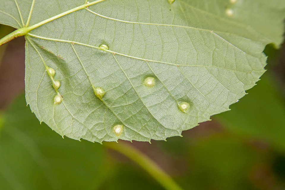 Lime nail gall mite (Eriophyes tiliae) creates slender, raised, finger-like galls on the upper leaf surface. |