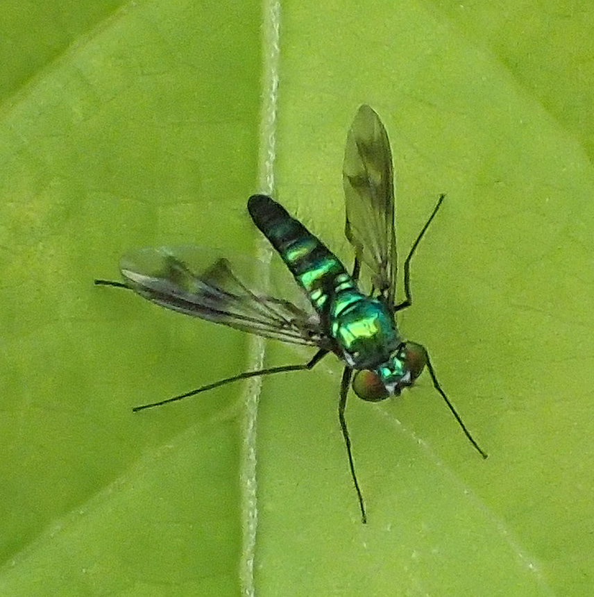 Condylostylus patibulatus I found this Condylostylus patibulatus, bluish long-legged fly, at a hedgerow near a tallgrass prairie in Racine Co., WI on June 26,2025. This fly was about 5 mm long. It was raining when I took the pictures. |