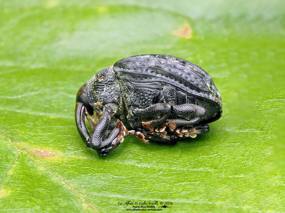 Milkweed stem weevil is a small snout beetle. It occurs in the United States from Maine and Florida west to Utah and Arizona, and in Canada in Quebec and Ontario. Adults feed on the leaves, stems, and pods of mostly common milkweed but also on other milkweed species. Larvae feed on the stems of the same plants. Adults are black, hard bodied, robust, oval, and 3⁄16″ to ¼″ (5.5 to 6.5 mm) long. They are convex when viewed from the side. They are almost completely free of hairs and scales. The head is greatly elongated between the eyes and the mouth parts form a conspicuous snout (rostrum). The rostrum is almost cylinder-shaped, projected forward, and slightly bent downward. It is shorter than the head and thorax combined. The antennae are short. slender, elbowed, and reddish. They have 11 segments. The last 3 segments are expanded and form a club. The thorax is composed of three segments. The first segment (prothorax) is large and prominent and appears to be the entire thorax. It is covered by a saddle-shaped plate (pronotum). The pronotum is wider than long, strongly arched at the sides, and narrower than the hardened wing covers (elytra). It is covered with deep, longitudinal grooves. The grooves are parallel to the midline, not oblique. The elytra completely cover the abdomen. They are grooved and have narrow ridges between the grooves. Within the grooves there are two rows of deep pits (punctures). The legs are mostly black except for the last part of the leg (tarsus), corresponding to the foot, which is reddish. The tarsus has 5 segments, but the fourth segment is very small and is concealed within the lobes at the end of the third segment, making it appear to have just 4 segments. |