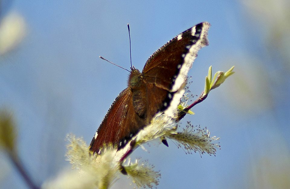 This is usually the first butterfly seen in the spring because most adults overwinter. It is also one of the longest lived butterflies in Minnesota, living up to 10 months. Caterpillars live in a communal web. After the new brood emerges in June or July they enter a period of dormancy (estivate) similar to hibernation. They fly again in September and October. Most adults hibernate in the winter in hollow logs, wood piles, and loose bark. Some adults migrate south in the fall. |
