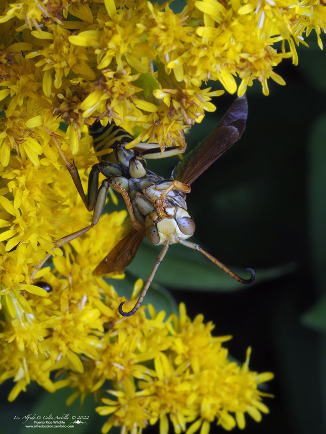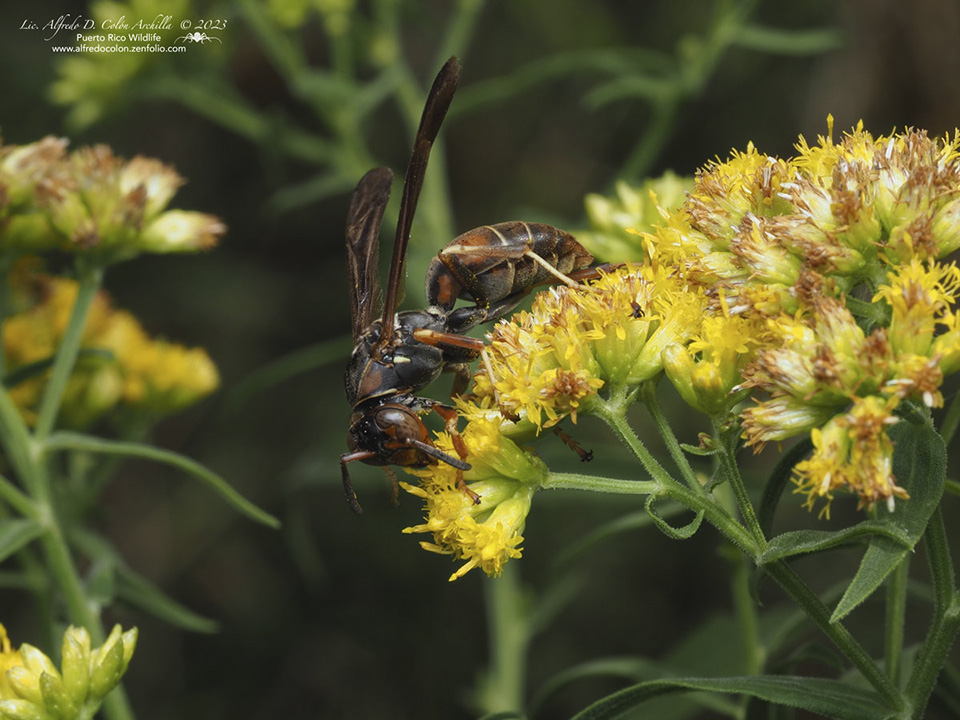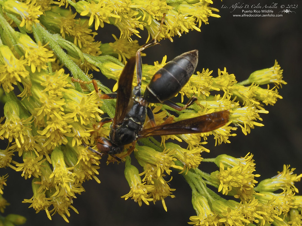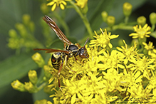 Northern paper wasp, also called dark paper wasp or golden paper wasp, is a medium-sized, predatory, social wasp. Adults are ⅝″ to 13 ⁄16″long. The body is slender. The head and thorax are covered with extremely short, inconspicuous hairs. The color pattern is geographically variable. Three subspecies are recognized. There are two large compound eyes, one on each side of the head; and three small simple eyes (ocelli) at the top of the head between the compound eyes. The area below the compound eye (gena) is wide from the back of the head to the jaw (mandible), not tapered. There is a band on the gena that reddish-brown, yellow, or partly both. The plate that makes up the face is pointed at the end. It is yellow or reddish-brown and has no black marks. The antennae are long and thread-like, not clubbed. They are brownish-black above, yellow below. On males they are conspicuously curled at the tip and the last four segments are entirely brownish-black. The dorsal surface of the thorax (pronotum) is black with no stripes down the middle. A yellow or reddish-brown band at the leading edge of the pronotum is continuous, not interrupted at the apex (nearest to the head). The abdomen of the female has six segments, while that of the male has seven segments. The base of the abdomen is constricted, forming a waist, but not stalked. The upper plate (tergum) of each abdominal segment is brownish-black with yellow or reddish-brown markings or both. The first tergum is wider than long, not stalk-like, and the leading edge is gently rounded in profile. On males, the hind (posterior) margin of each tergum has a narrow band of yellow or reddish-brown. These may be absent on females in the northern part of the range of this species. The legs are long and yellow. On the middle leg the fourth segment (tibia) has two spurs at the end. The claws at the end of the foot (tarsus) are simple, not forked. The wings are smoky and clear. When at rest they are folded over the body. The forewing has three submarginal cells. The first discoidal cell is very long, about half as long as the entire wing. The first subdiscoidal cell does not touch the medial cell. |