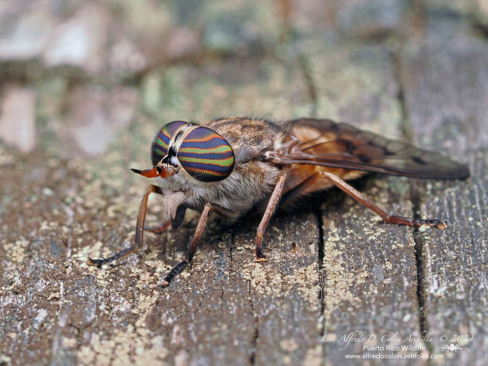 Orange-sided horse fly is a common, easily recognized, moderate-sized, horse fly. It occurs in the United States and southern Canada east of the Great Plains, but it is mostly absent from the deep south. Adults are active from mid-April to mid-July in other areas, but all records from Minnesota are from early May to early July. Males feed on plant nectar. Females feed on the blood of mammals. The larvae are found in moist or wet sod, in sphagnum bogs, and in marshes. Adults are stout-bodied and ½″ to ⅝″ (12 to 15 mm) in length. On the female, the head is broad and it is covered with yellow hairs. Details of the head are important features in identifying species in the genus Hybomitra. The compound eyes are dark reddish-purple with 4 bright greenish-blue bands. They are densely covered with long hairs. They do not meet at the top of the head. There are no simple eyes (ocelli), but in their place there is a raised black bump (ocelli tubercle). From a distance, the tubercle could easily be mistaken for ocelli. Between the eyes, there are three shiny, black, hardened areas (calluses): a subcallus above the antennae bases; a basal callus above and adjacent to the subcallus; and a median callus halfway between the ocelli tubercle and the basal callus. The subcallus is completely hairless (bare). The basal callus is hemispherical. The median callus is small. Both the cheeks (gena) and the plate on the face above the upper lip (clypeus) are hairy. The antennae are mostly orange, black just at the tip. The thorax is brownish black with four narrow longitudinal pale stripes. On each side of the thorax, the small elongated triangular plate below the prescutum (notopleuron) is pale or reddish, and it contrasts with adjacent thoracic plates. The abdomen has 7 segments (tergites). It is brownish black with a highly variable amount of orange. Typically, tergites 1 through 4 are mostly orange on the sides and dark in the middle. The wings are faintly tinted. All crossveins are bordered with a conspicuous black spot, and there is a conspicuous black spot on the fork of vein R4+5. On males the compound eyes meet at the top of the head. The eyes have just 3 color bands all on the lower half of the eye. The body is slightly darker due to more abundant black hairs. |