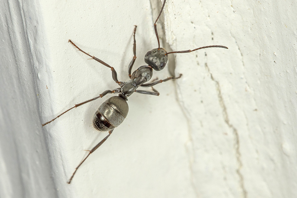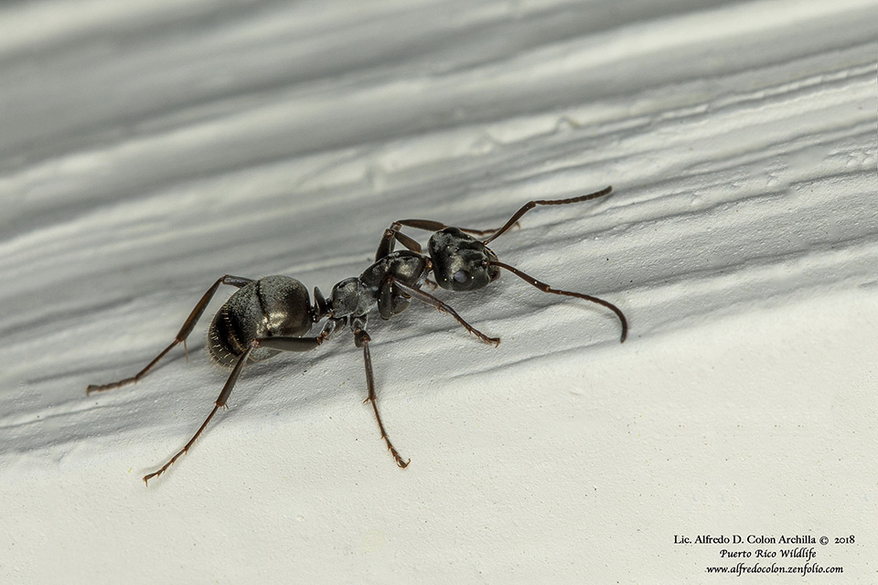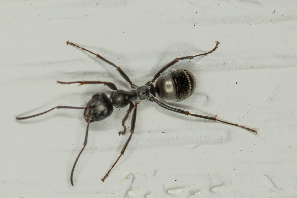 Podzol ant, also called podzol mound ant, occurs in two unconnected areas of North America. The eastern range is the northern United States and southern Canada west to Minnesota and south to Ohio. The western range is the mountainous west from Alaska and northern Canada to northern Mexico. It is found mostly in cold coniferous forests. Workers are ⅛″ to 5 ⁄16″ (4 to 8 mm) long, black, and somewhat shiny. Winged males and queens are about the same size, 3 ⁄16″ to ½″ (5 to 13 mm) long. The head is broadly rounded in outline. The rear margin is rounded, not distinctly concave. The eyes are large. The facial plate above the mouth (clypeus) is not notched. The finger-like sensory mouth part (maxillary palp) is long and has six segments. The basal segment of each antenna (scape) is long, but is shorter than the length of the head. The first body segment behind the head (mesosoma) has two distinct elevated areas (bumps). It is covered with three exoskeletal plates, the pronotum and mesonotum covering the thorax, and the propodeum covering the first segment of the abdomen that is fused to the thorax. The pronotum and mesonotum form one smooth convex bump, the propodeum a second convex bump. The second abdominal segment (petiole) is narrow and waist-like, and has a single raised bump (node). The remainder of the abdomen (gaster) is bulbous. The head, mesosoma, legs, and first three segments of the gaster are covered with silvery appressed hairs. The fourth segment of the gaster is bare or almost bare. There are single rows of erect golden hairs at the end of each segment. On the first segment there are also usually 10 to 25, sometimes just 1 to 3, erect hairs not including the row at the end. Those are each shorter than or equal to the distance between them. |