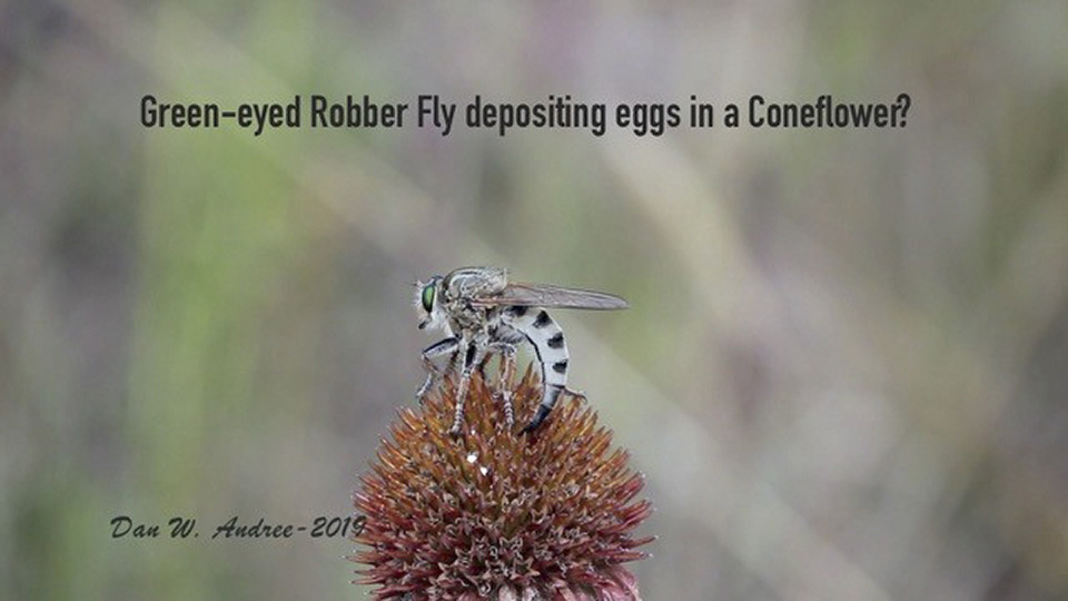 ? on Green-eyed Robber Fly... I noticed what I believe to be a Green-eyed Robber Fly motioning it tail end in and out of this Coneflower. I believe it was depositing eggs in it. It would poke it in and out several times and I filmed it doing so. |