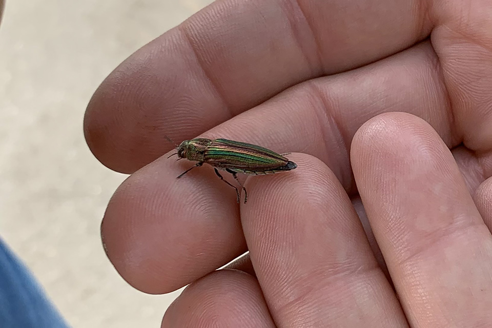Striated jewel beetle is a medium-sized to large metallic wood-boring beetle. It occurs in the United States from Maine to Maryland, west through the Great Lakes states to Minnesota, and south along the Appalachian Mountain states to Georgia, and in Florida. It also occurs in southern Canada from Nova Scotia to Ontario. Adults and larvae are associated only with coniferous trees, mostly with pine, but also with hemlock and spruce. Adults are active in spring and early summer, when they can be seen on needles. They overwinter under the bark. The larvae are found in decaying stumps and logs, especially of trees in their second year of death. They are sometimes also found in living wood, where they create mines in the sapwood. If the mines encircle the trunk, the flow of sap stops and the tree dies. Adults are ½″ to ¾″ (13.0 to 20.0 mm) in length. The body is rigid, oblong, and broadly flattened. The overall color ranges from entirely dull coppery brown with coppery reflections, to coppery brown with some brilliant green or blue, to mostly brilliant green or blue with coppery brown at the margins. The male is narrower than the female. The head is slightly tucked under the broader first segment of the thorax (prothorax). The antennae have 11 segments. The fourth through eleventh segments are distinctly saw-toothed (serrate). The eyes are widely separated. The mouthparts are directed downwards. The plate on the upper side of the prothorax (pronotum) has a shallow depression in the middle from the rear almost to the front margin. The sides are almost parallel. The surface is coarsely pitted (punctate), but there are sometimes smooth areas on each side of the middle. It is mostly covered with long pale hairs, though these are often worn off in the middle. The plate between the wing bases (scutellum) is round and small but visible. The wing covers (elytra) are a little wider at the base than the pronotum. They are almost parallel at the base, widest just beyond the middle, and strongly narrowed to the tip. The tips are cut off (truncate). Each elytron has four shallowly raised, longitudinal ribs extending from the base to the tip, and an additional short rib at the side of the scutellum. The area between the ribs is flat and densely punctate. The species epithet striata translates to “striped”, but in entomology it means “grooved”. In this case, it is a misnomer. The elytra are ridged (costate), not grooved (striate). On the front legs, the fourth segment (tibia) does not have notches, a spine, or a tooth at the tip. The last part of each leg (tarsus), corresponding to the foot, has 5 segments. There is a pair of claws at the tip of each tarsus. The claws are equal in size, and they are simple, not split or toothed. |