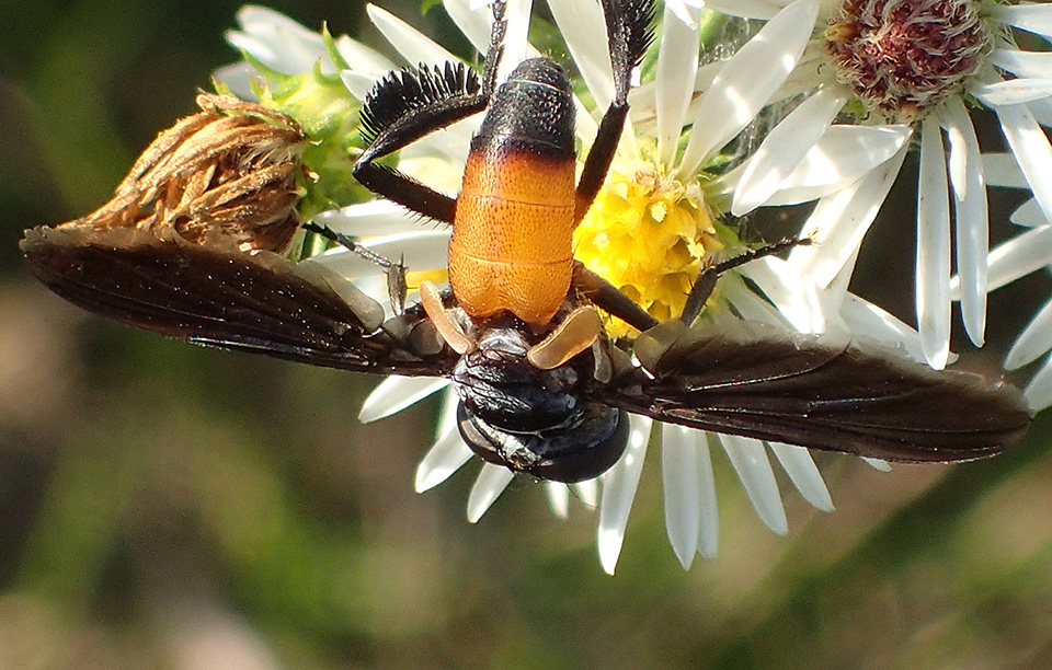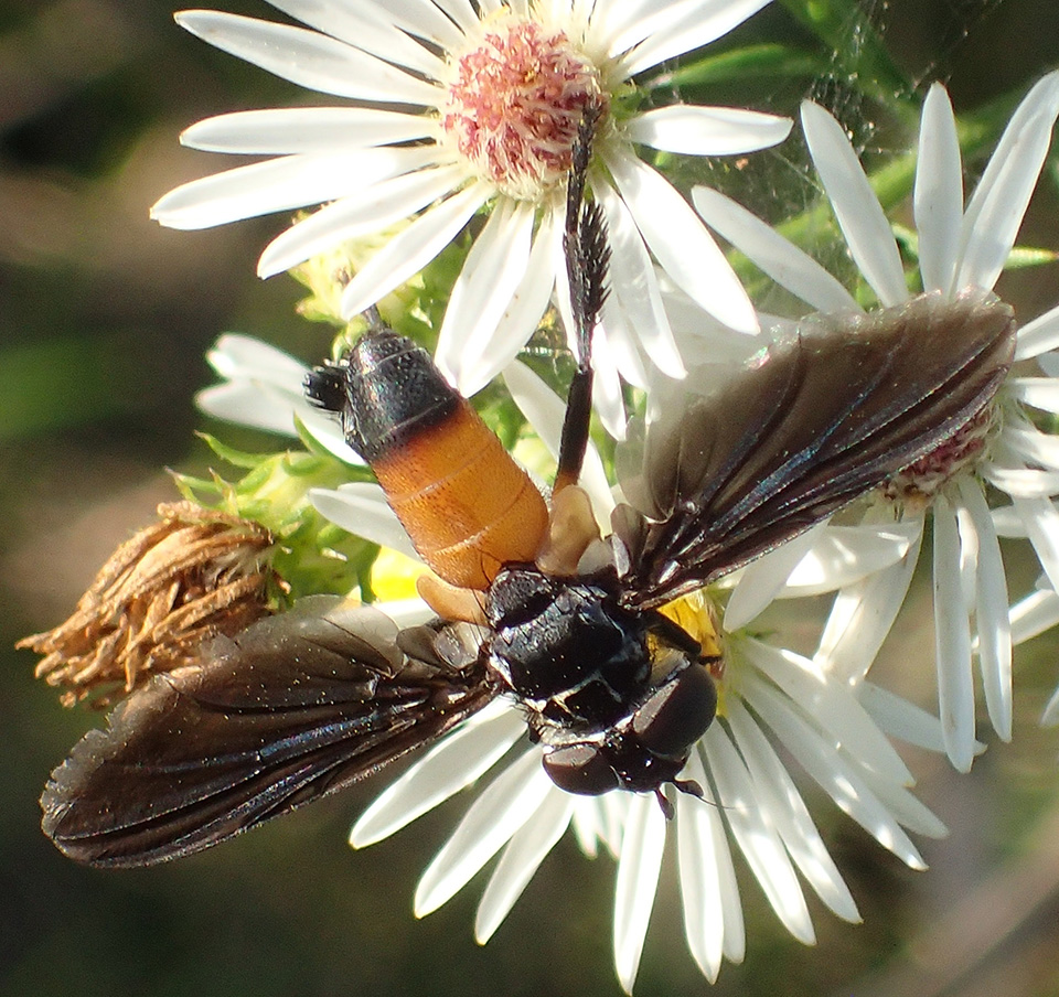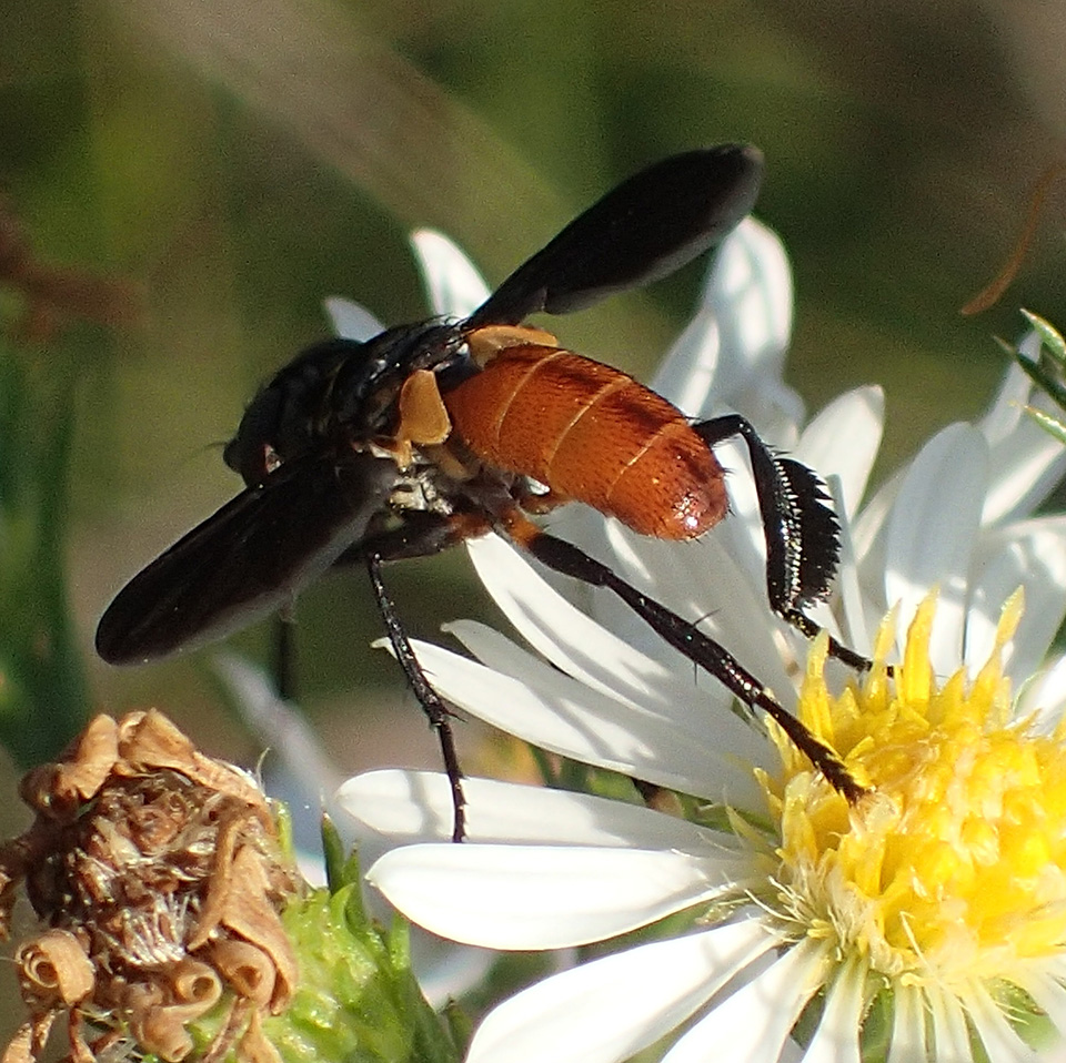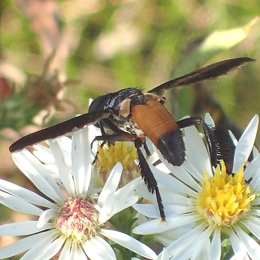 Trichopoda pennipes Swift feather-legged fly Trichopoda pennipes, swift feather-legged fly, on white aster flowers. Photos were taken on October 2, 2023 at Barnes Prairie, Racine Co., WI. Temperature about 78F, windy, sunny, late afternoon. There were several of these flies on white aster flowers. They've been prevalent here this year, along with a number of stinkbugs, which are one of their larval hosts. |