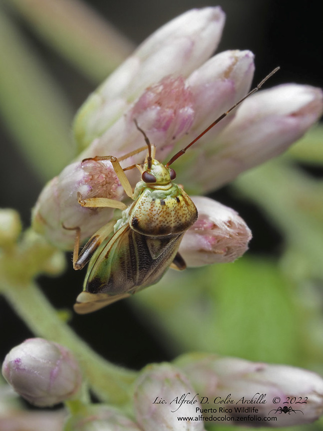 Tarnished plant bug is a very common, native, plant bug. It occurs throughout the United States, southern Canada, and Mexico. It is found in fields, meadows, gardens, parks, woodlands, agricultural fields, orchards, nurseries, and greenhouses. Tarnished plant bugs have been recorded feeding on at least 385 species of plants. They are a serious economic pest of many agricultural crops, including apples, carrots, cherries, cotton, lima beans, seed alfalfa, snap beans, soybeans, peaches, pears, strawberries, and tomatoes. They are also an important pest of conifer seedlings in nurseries. Other crops they attack include artichoke, asparagus, broccoli, cabbage, celery, chard, coriander, corn, cowpea, cucumber, eggplant, endive, escarole, fava bean, fennel, horseradish, lettuce, mustard, onion, parsnip, parsley, pea, pepper, potato, radish, spinach, squash, sweet potato, turnip, and watermelon. In greenhouses, they attack asters, chrysanthemums, dahlias, impatiens, and marigolds. In nurseries they attack loblolly pine, white spruce, lodgepole pine, Douglas-fir, and western larch. Adult males are 3⁄16″ to ¼″ (4.90 to 5.95 mm) in length and ⅛″ (2.38 to 3.01 mm) wide. Females are 3⁄16″ to ¼″ (5.25 to 5.95 mm) in length and ⅛″ (2.52 to 3.01 mm) wide. The body is oval and soft. The coloration is variable. There are three or more generations per year between May and October. Summer adults tend to be light colored, and overwintering adults, the last generation, are dark colored. The body is yellow (pale) with dark reddish brown to black (dark) markings. It is covered with long, reclining, yellow hairs. The head is slanted forward and yellowish brown. The compound eyes are large. There are no simple eyes (ocelli). There is a prominent raised ridge (carina) between the eyes. The upper part of the face (frons) is smooth, with no grooves or ridges. A dark longitudinal stripe in the middle (median) extends from the top of the frons to the bottom on the plate above the upper lip (clypeus). There is an oblique, dark stripe on the frons on each side of the middle (submedian). The cheeks (genae) are black. The mouth parts are optimized for piercing and sucking. They take the form of a long, 4-segmented beak. When not used, the beak extends from the front of the head, along the underside of the body between the legs, to or slightly behind the tip of the first segment (coxa) of the hind legs. The antennae are slender, thread-like, and short. They have 4 segments. The second segment is shorter than the width of the head. The exoskeletal plate covering the first segment of the thorax (pronotum) is widest at the base and much narrower behind the head. It has a distinct, exposed collar in front, and the rear angles are rounded. There is a small, rounded tubercle (callus) at the front outer angle on each side of the pronotum behind the collar. The pronotum is pale to reddish brown with broad, black, longitudinal stripes, black near the callus, black at the rear corners, blackish at the rear margin, and a thin pale longitudinal line in the middle (middorsal). The surface of the pronotum is densely pitted (punctate) with coarse, dark punctures. The exoskeletal plate between the wing bases (scutellum) is large and triangular. It is dark on the sides and at the base with a distinct, large, pale, Y-shaped or heart-shaped marking. There are two pairs of wings. The front wings (hemelytra) are longer than the hind wings and a little longer than the body. They are held flat over the body when at rest. On light-colored individuals, they are pale with dark streaks and a variable amount of dark shading. On dark-colored individuals, they are dark with pale streaks to almost entirely dark. The surface is densely punctate. The hemelytra have a thickened, leathery part at the base and a thin membranous part at the tip with a clear dividing line between the two. The thickened part is comprised of the narrow area (clavus) behind the scutellum when the wings are closed, and the broad marginal area (corium). At the end of the corium there is a small but distinct triangular area (cuneus). The corium always has a short, narrow, pale stripe on the inner margin at its widest point, which is near the tip of the membrane. The cuneus is pale. It has a dark, crescent-shaped band near the top, and the tip is black. The membrane is dark. The veins are pale and moderately to faintly contrasting with the dark membrane. The hind wings are thin and membranous. The legs are relatively long. |