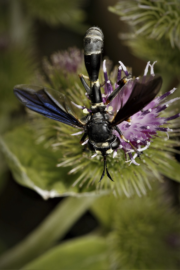 Physoconops is a genus of thick-headed flies (family Conopidae). There are 13 currently recognized species of Physoconops in North America north of Mexico. At least five are found in Minnesota or surrounding states. At 5 ⁄16″ to ⅜″ (8 to 10 mm) in length, Physoconops obscuripennis is a small to medium-sized thick-headed fly. With a thread-waisted body and yellow and black coloration, it strongly resembles a wasp. The head is broad, a little wider than the thorax. There are two large compound eyes and no simple eyes (ocelli). The compound eyes are situated at the sides of the head and do not meet in the middle on either sex. The face and cheeks are yellow and prominently grooved. The grooves are not darkened. The top of the head (vertex) and the area above the face, corresponding to the forehead (frons) are entirely black. The frons is longer than wide, and has a coppery sheen when viewed at an angle. On the back of the head, next to each compound eye, there is a shiny yellow line extending to the vertex, and in the middle a small but prominent triangular or V-shaped mark. The protruding mouthpart (proboscis) projects forward needle-like. It is long, straight (not elbowed), nearly black, and conspicuously swollen at the base. The antennae have three segments. They are straight, black, and long, longer than the head, and are project forward and up. The first and third segments are reddish below and are each about half as long as the second segment. The third segment is cone-shaped and has a slender, elongated process (style) at the tip. The thorax is black. The front angles are narrow, black, and raised like shoulder pads. On each side there is a yellow spot just behind the shoulder (humeral) area, a smaller, less distinct spot near the wing base, and a large pale spot in front of the base of the haltere. The halteres are knob-like and bright yellow. The exoskeletal plate between the wing bases (scutellum) is dark brown or black. The abdomen is black and has six segments. Segment 2 and part of segment 3 are very constricted (petiolate). The tip of segment 2 and the beginning of segment 3 are yellow, and there is a narrow yellow hind border on segments 3, 4, and 5. Segment 6 has a yellowish dusting at the end. The legs are slender and mostly dark brown or black. The first segment (coxa), the tips of the third segment (femur), and the basal half of the fourth segment (tibia) are yellow. The last part of the leg (tarsus), corresponding to a foot, has five segments. The forward (anterior) half of each wing is dark smoky brown to the submarginal cell but pales near the end. The remainder is translucent but tinted smoky brown. There is no distinct outline between the dark and translucent smoky areas. There is a small cross-vein near the middle of the discal cell. |