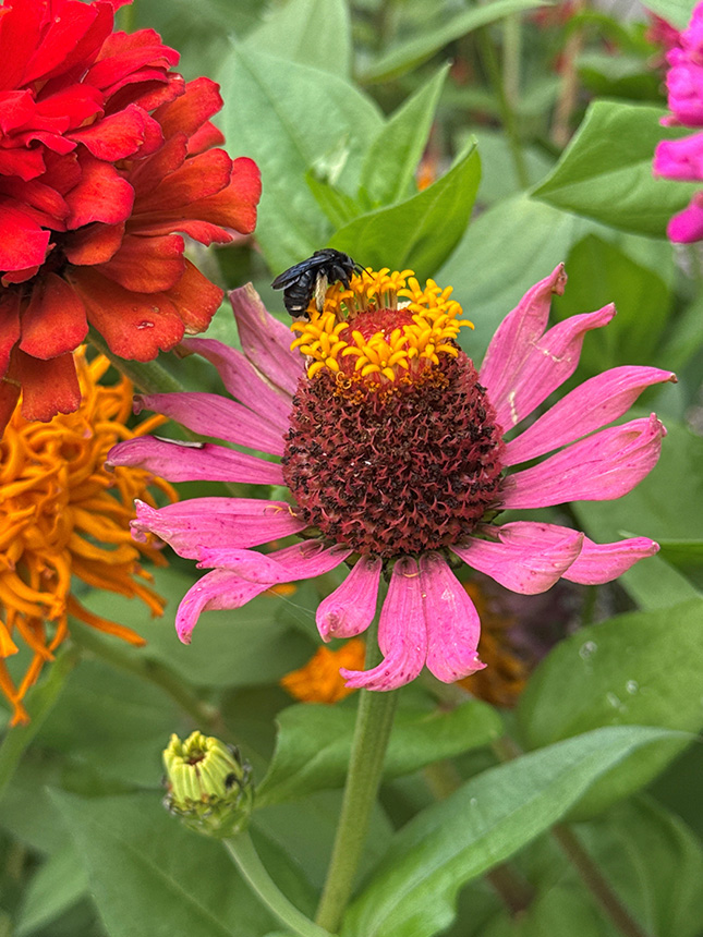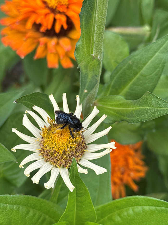 These guys are going crazy over our zinnias! Wile dead heading the zinnias one flew by my hand, at first glance I thought they might be a bald faced hornet and got worried. Definitely relieved they are two-spotted long horned bees! |
