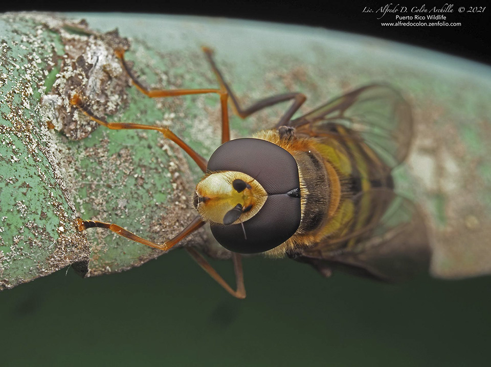 Undivided lucent is a large, widespread but uncommon, hover fly. It occurs in the United States and southern Canada in three geographically separated regions. In the east it occurs from New Brunswick to South Carolina, west to Minnesota and eastern Texas. In the west it occurs from southern British Columbia and Alberta, south to northern California. Another population occurs from western Nebraska south to New Mexico and eastern Arizona. Undivided lucent is uncommon throughout these ranges. It is found from June to October in forests, forest edges, and bogs. The larvae feed on tree-dwelling (arboreal) aphids, especially giant bark aphids, and are often found in basswood and sycamore trees. Adults are ⅜″ to ⅝″ (9.7 to 15.0 mm) in length. The head is wider than the thorax. There are two large compound eyes on the sides of the head and three small simple eyes (ocelli) in a triangle on top of the head. The compound eyes have extremely sparse, moderately long hairs, and there is a fringe of yellow hairs at the back of each eye. On the male the eyes meet at the top of the head. On the female they do not. The face is mostly yellow, including the lower margin. There is a narrow brown stripe in the middle of the lower half, but this is sometimes indistinct. On the male, there is a small dark spot above the base of each antenna. On the female, the spots converge to form a long, inverted, Y-shaped mark that extends to the top of the head. The arms of the “Y” are narrower than the space between them. The protruding mouthpart (proboscis) is short and fleshy. The antennae are short and have just three segments. The third segment is large, twice as long as wide, and has a stiff, forward-pointing bristle (arista) on the upper side. The exoskeletal plate on the first segment of the thorax (scutum) is large, shiny, and greenish black. It is covered with short, erect, yellow hairs, densely on the sides, sparsely above. The exoskeletal plate between the abdomen and thorax (scutellum) is large, rounded, dull yellow, and translucent. It is covered with pale yellow hairs on the front third or more, black hairs on the rear half or more, and it has a moderately dense fringe on the rear margin. In the western population, the scutellum on the female is black. The abdomen is longer and broader than the thorax, oval when viewed from above, and nearly flat when viewed from the side. It is black with yellow to translucent markings. There are five visible segments (tergites). The sides of each tergite are narrowly extended and flattened (margined). The first tergite (T1) is very narrow and entirely black. T2 has a pair of broad, oblique spots that do not meet in the middle. T3 and T4 each have a broad yellow band that does not quite reach the lateral margins. The forward margin of each band is nearly straight, the rear margin is deeply narrowed in the middle but never interrupted. This is the feature that gives the species its common name. On the male T5 usually has a yellow spot on each side but is always at least somewhat yellowish or reddish in front on each side. On the female T5 has a yellow band that is similar to that on T3 and T4, but it is much narrower, and it is sometimes interrupted in the middle. The legs are black and yellow. The wings are clear and are mostly covered with short erect hairs. There is a spurious vein between the radius (R) and media (M) veins. The anal cell is long and is closed near the wing margin. The marginal, R5, and M2 cells are also closed. The R4+5 vein is distinctly sinuous, dipping deeply into the r4+5 cell. |