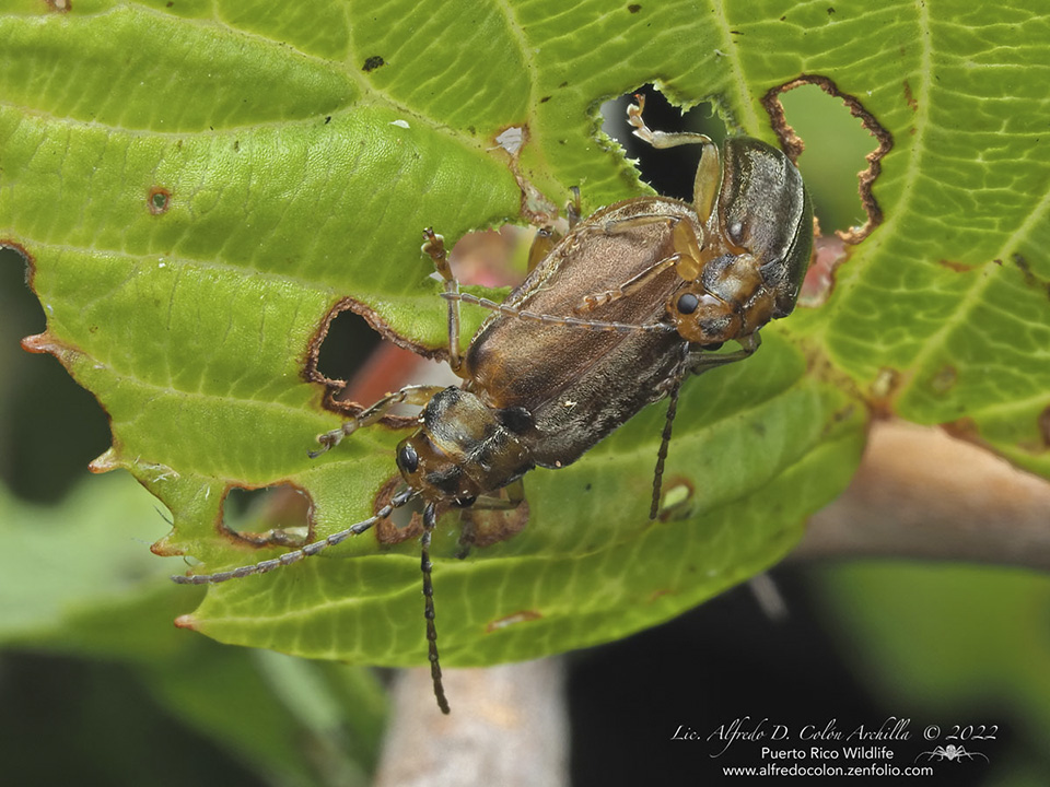 The larvae chew holes in the leaves between the veins, leaving a lace-like (skeletonized) pattern. The adults chew circular to elliptical holes in the leaves. A heavy infestation of VLB can completely defoliate a plant, causing reduced vigor or the death of the plant. |