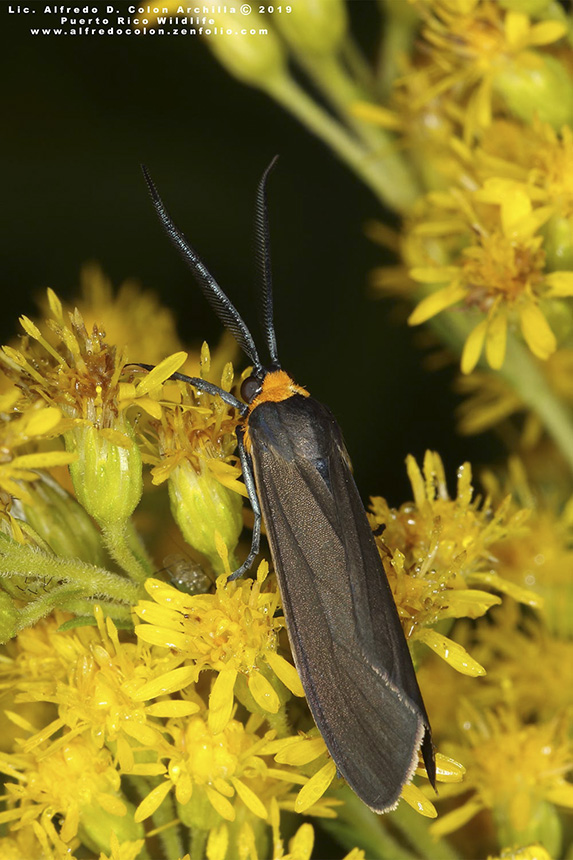 Yellow-collared scape moth is a small to medium-sized, day flying, wasp-mimic, tiger moth. It occurs across North America from east coast to the west coast and from Texas to the Northwest Territories. Adults are ⅝″ to ¾″ (16 to 20 mm) in length and have a 1⅛″ to 1 7 ⁄16″ (29 to 37 mm) wingspan. They look superficially similar to the closely related Virginia ctenucha but are smaller and narrower. The head is black. The antennae are black and feather-like, with branches only on one side of most segments. The basal segment (scape) is long. The thorax is black or dark brown. There are brightly colored scales on the first section of the thorax (prothorax) forming a broad collar that extends across the upper (dorsal) surface and down the sides. The scales are orange on most individuals, orangish-yellow or yellow on others. The abdomen is black and often has a metallic blue iridescence. The forewings are dark brown to blackish-brown, long, and narrow. The hindwings are smaller, black around the edges, grayish-white and translucent with black veins in the middle. They are hidden when the moth is perched. The caterpillar is up to 1 3 ⁄16″ (3 cm) long. The thorax and abdomen are yellow with a black stripe down the middle (middorsal), a broad black stripe on each side, and a narrow brownish-orange stripe in the subdorsal area and in the subspiracular area. The head is pale brownish-orange, and shiny. On most caterpillars,there is a dark line across the face or dark markings around the eyes. The body is mostly hidden beneath dense tufts of long, stiff, dirty white hairs (seta). The setae rise from circular warts that are not colored. The warts on the second and third thoracic segment (T2 and T3) and on the ninth abdominal segment (A9) are enlarged and oval. The front and back parts of the body also have longer darker hairs. The abdominal leg-like structures (prolegs) are pale. |