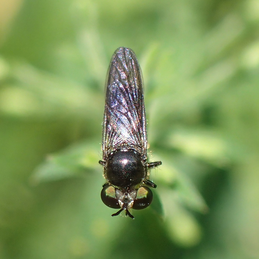 Yellow-faced micropanther is a small robber fly. It occurs in the United States east of the Great Plains and in southern Ontario Canada. Adults are active from mid-June to mid-August. They are found in open fields and at forest edges. They are often seen landing on the tips of twigs, leaves, and grass blades. They prey mostly on small flying insects including bees, wasps, and beetles. Adults are 3⁄16″to ⅜″ (5 to 9 mm) in length. The body is black and robust. The head is black, short, and unusually wide. There are two large, brown, compound eyes and three small simple eyes (ocelli). The compound eyes extend above the level of the top of the head (vertex). The vertex is flared posteriorly, much wider at the rear than at the front, and it is deeply excavated, appearing hollowed out. The ocelli are arranged in a triangle on a high, narrow, rounded projection (tubercle) in the middle of the head between the compound eyes. The hairs on the vertex and the upper side of the front of the head (frons) are brownish yellow. The face is very short. The antennae have 3 segments. The first segment is unusually long, the second segment is bead-like, and the third segment is as long or longer than the first two combined. The thorax is black and short. It appears humped when viewed from the side. The upper surface is shiny and it is densely covered with short, recumbent, pale yellow to brownish hairs. Though dense, the hairs do not obscure the shiny black surface. The hairs on the sides of the thorax are grayish to sometimes yellow. The abdomen is short, robust, black, and somewhat shiny. Six segments (tergites) are visible on both males and females. The surface is coarsely pitted (punctate). It is covered with scattered, somewhat appressed hairs in the middle, and longer, more erect hairs on the sides. The wings are clear and lightly tinged smoky brown, becoming paler at the base. The first and second branches of the radial sector vein (R1 and R2+3) join before the end of R1 creating a closed cell that does not reach the margin. The legs are stout and spiny. On each leg, the third segment (femur) is black, and the fourth segment (tibia) is reddish brown. The femur has fine, white, erect hairs on the sides and on the underside. On the front legs there are several long bristles on the tibia. On the hind legs, there are 3 or 4 long bristles near the base of the femur and several long bristles on the tibia. |