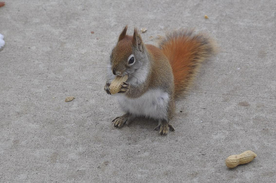 Location: Maple Grove, MN Red Squirrel, February 2016, never seen one before or since. Extremely fast at running away with the peanuts! |