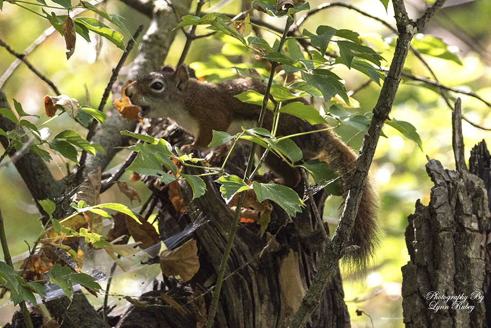 A Red Squirrel in The Big Stone National Wildlife Refuge climbing on a tree stump screaming out a warning to another hidden nearby, I back away and the other Red Squirrel ran to safety from the deep grass along the road. |